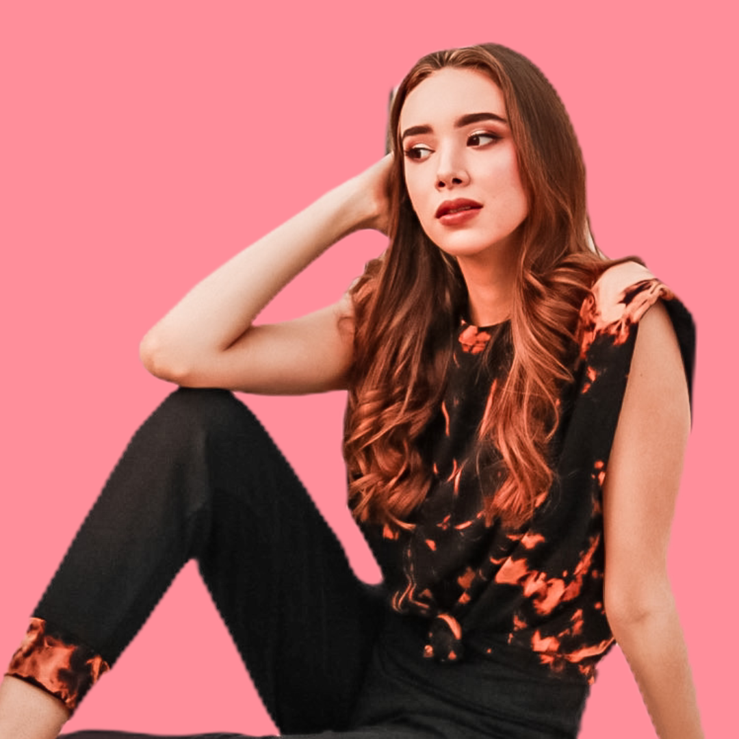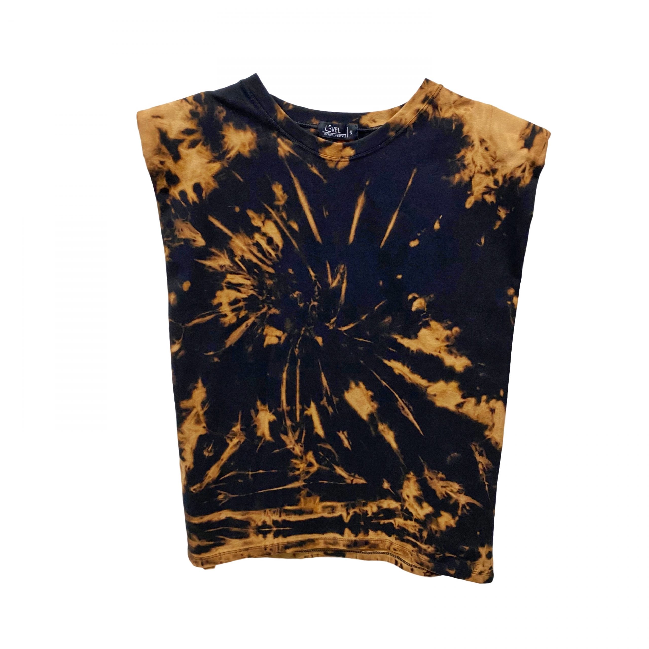 Camiseta con hombreras y cuello redondo de algodón y spandex con aplicación de técnica Tie Dye.