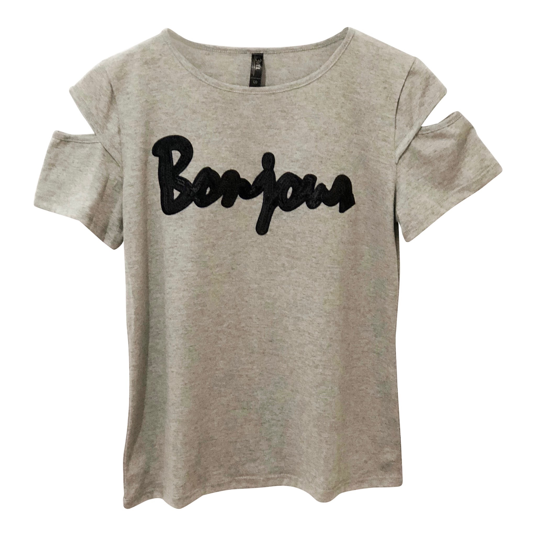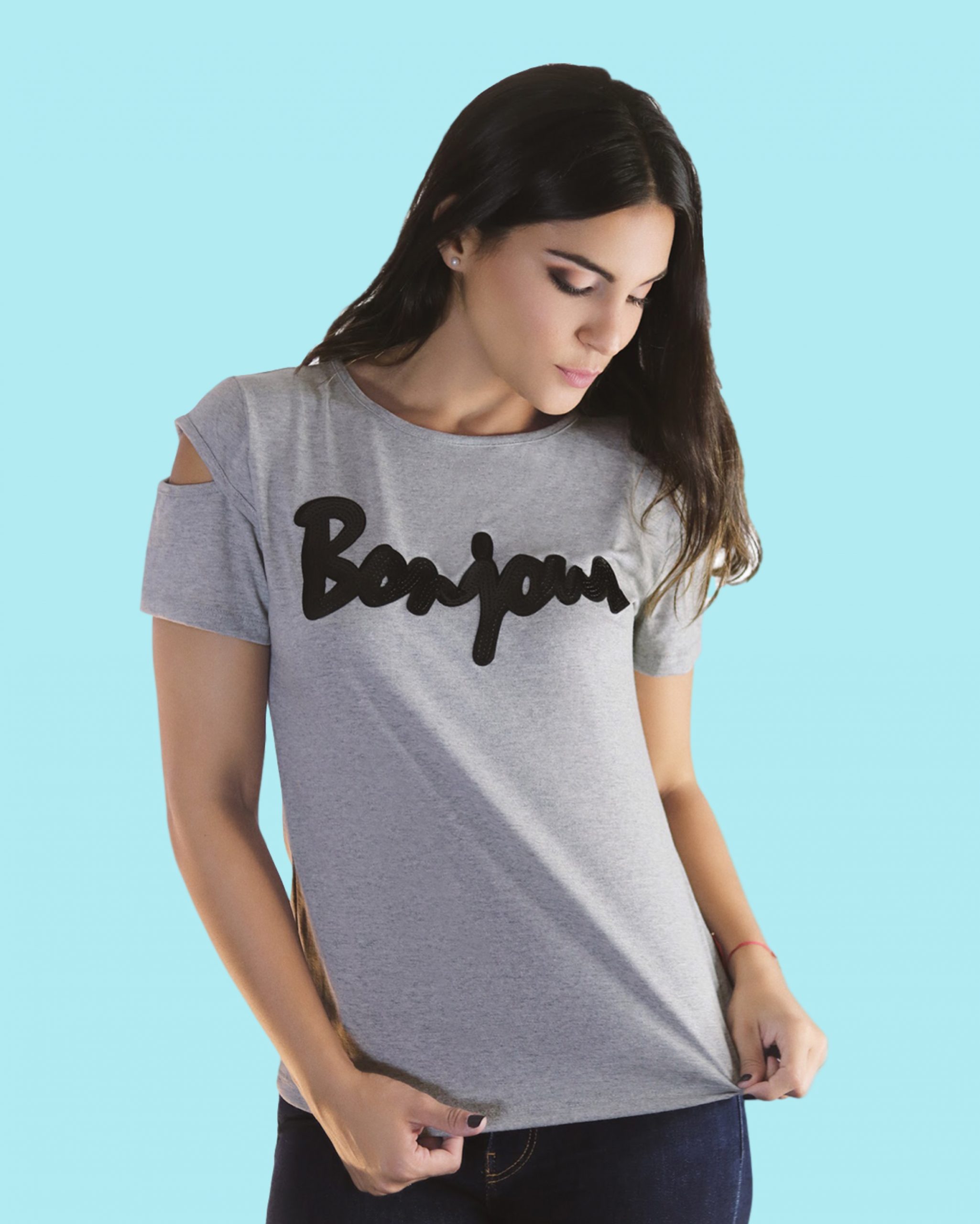 Camiseta de viscosa y spandex, con manga corta, abertura en la manga, cuello redondo y parche «BONJOUR» bordado con lentejuelas.