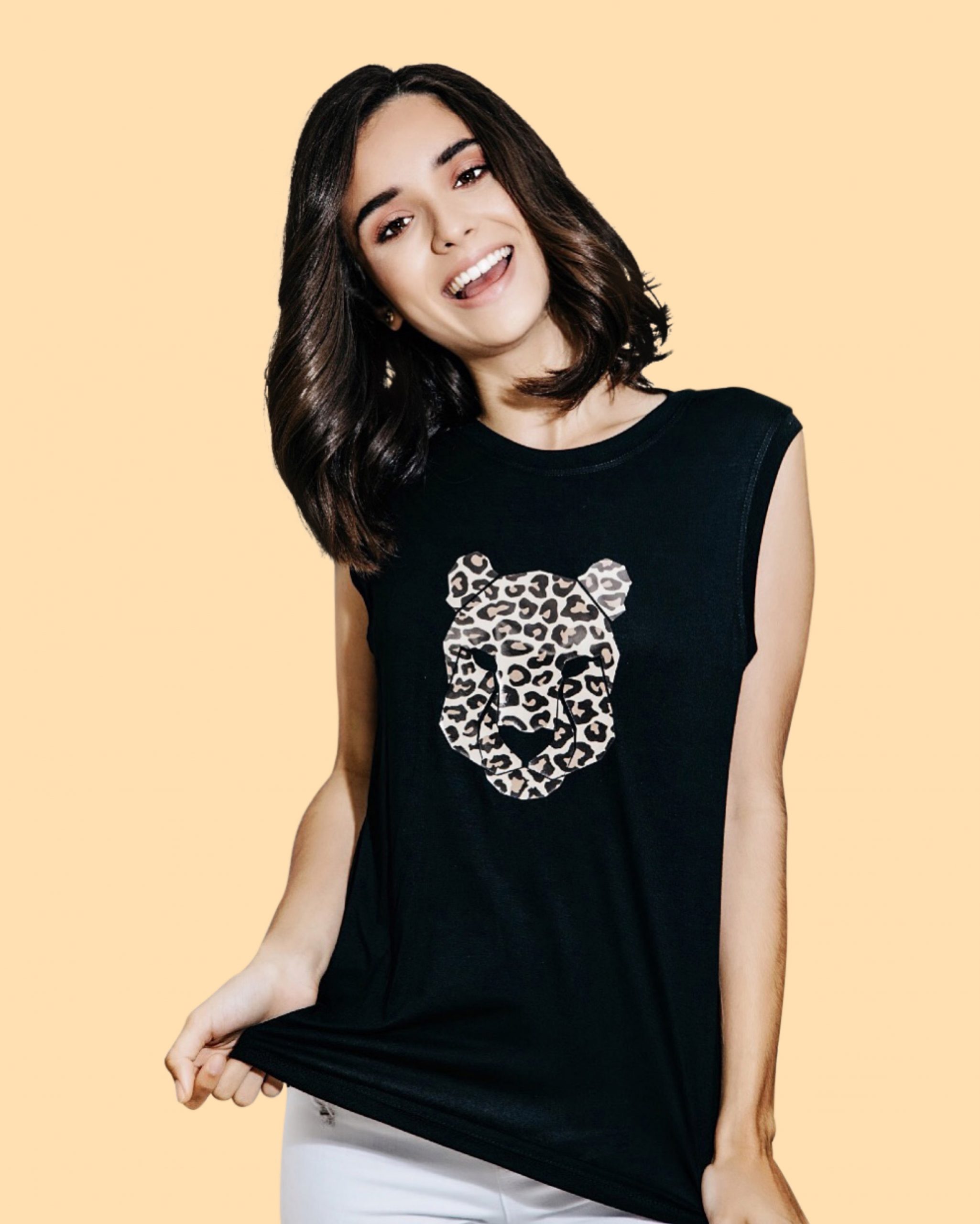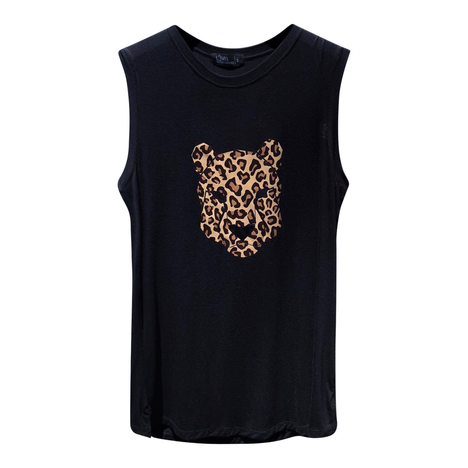 Camiseta de viscosa y spandex, sin mangas y diseño en vinil textil de animal print.