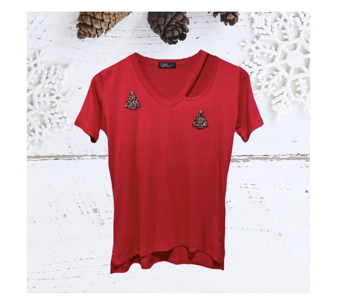 Camiseta de viscosa y spandex, con mangas cuello en V con roto a un lado y 2 apliques de brillos multicolores de arboles de navidad.