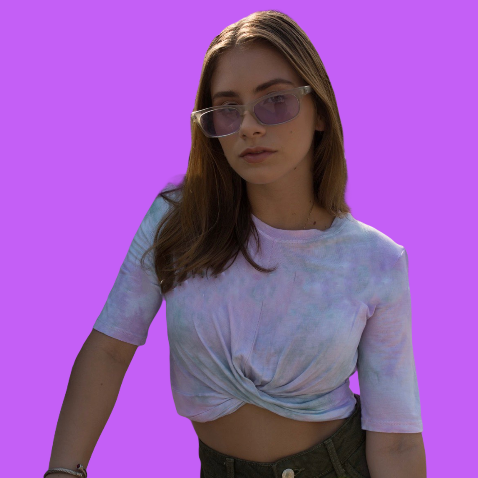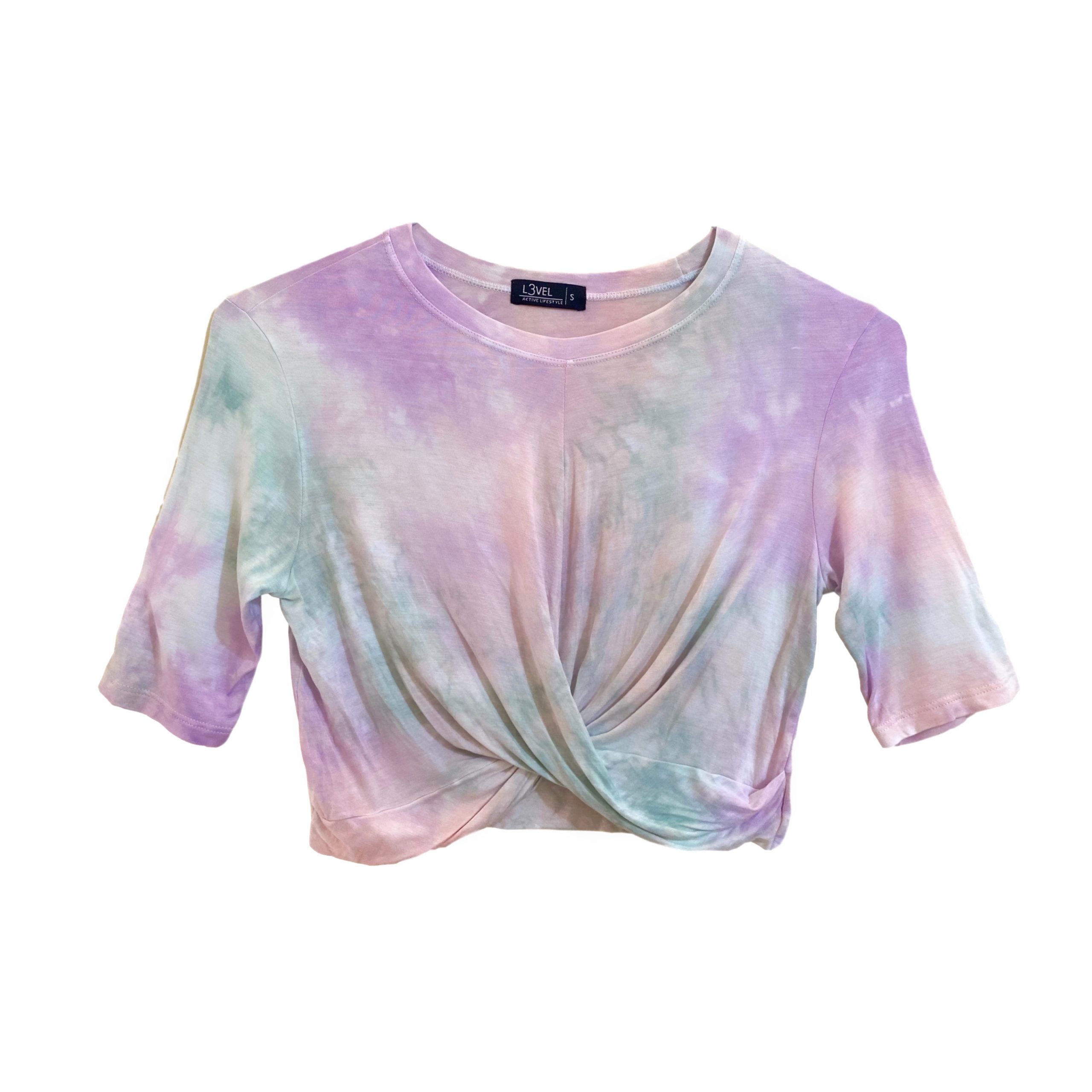 Crop Top de viscosa  y spandex, cruzado adelante con mangas 3/4  y  aplicación de técnica Tie Dye.
