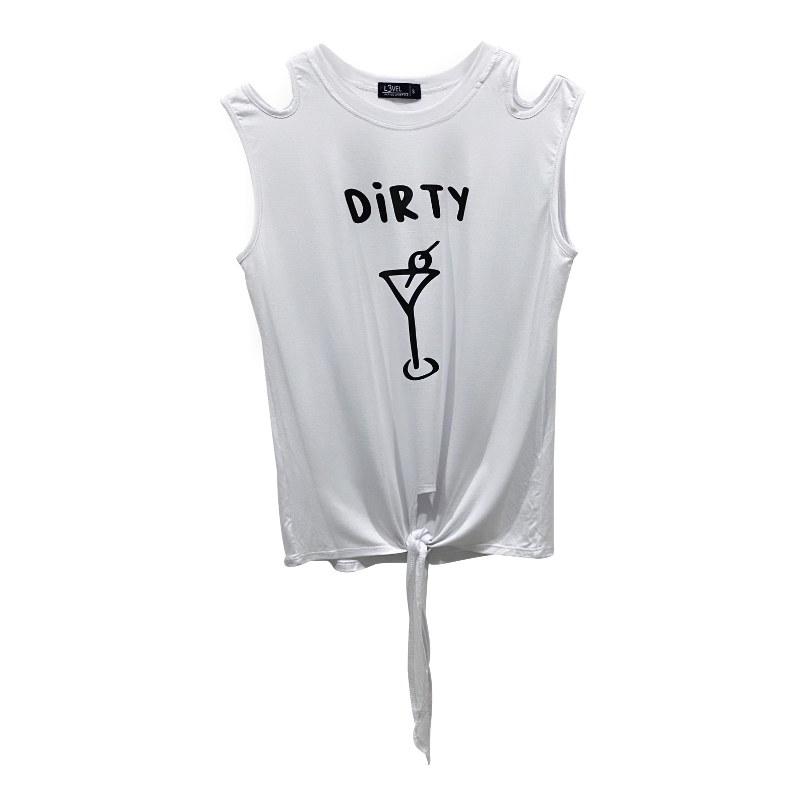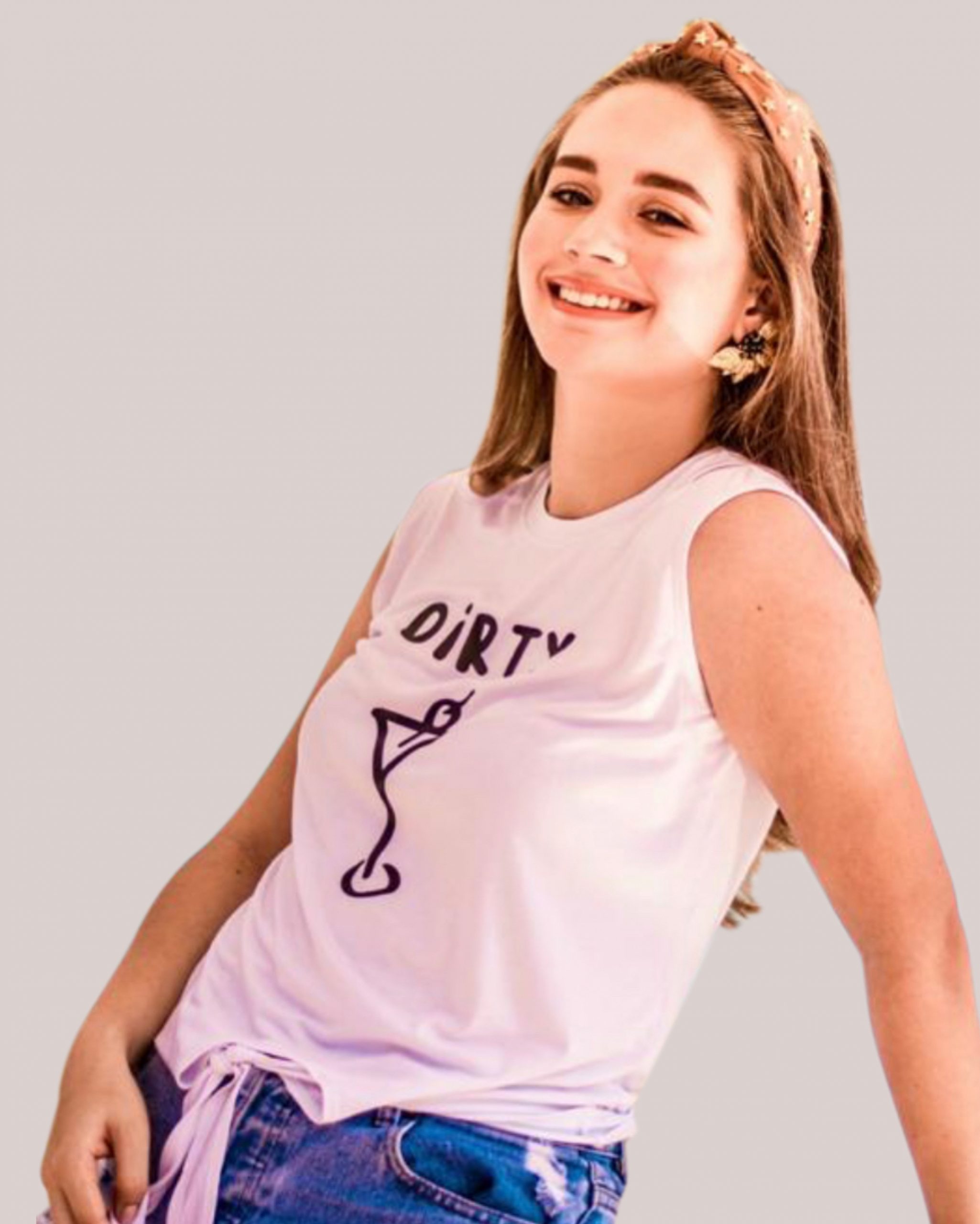 Camiseta de viscosa y spandex, sin mangas, cuello redondo con dos aberturas en los hombros y nudo adelante, con diseno de vinil textil.