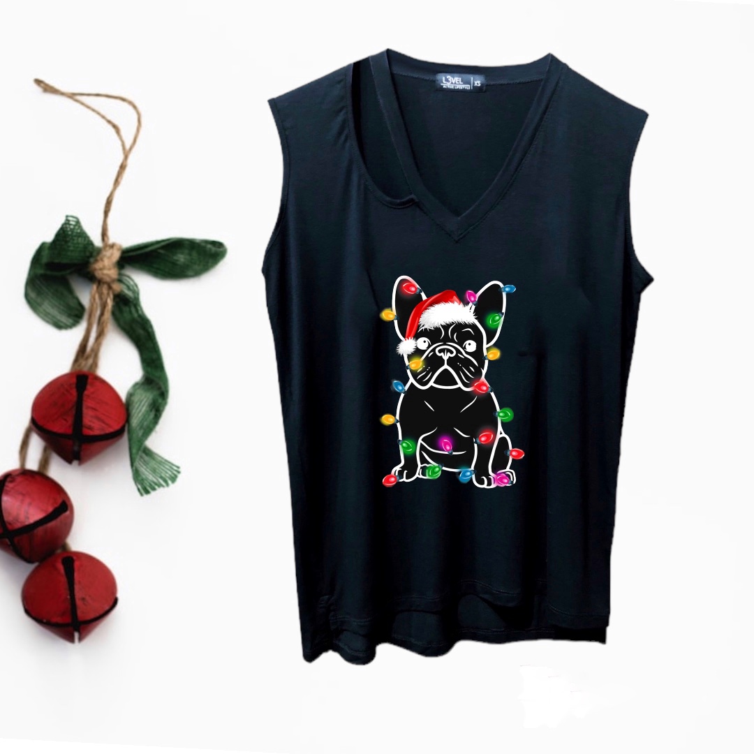 Camiseta de viscosa y spandex, sin mangas, cuello en V con diseño de vinil textil.