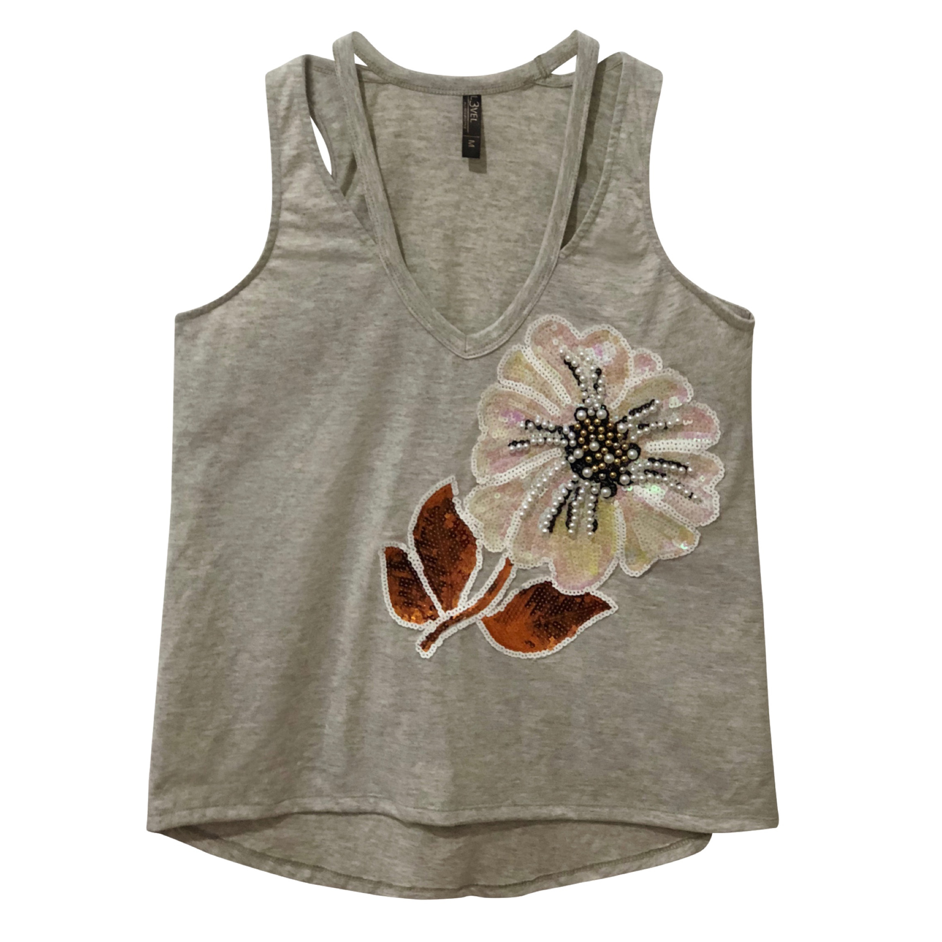 Camiseta de viscosa y spandex, sin mangas, cuello en V, con dos tira a los lados, y aplique de flor bordado con perlas y lentejuelas.
