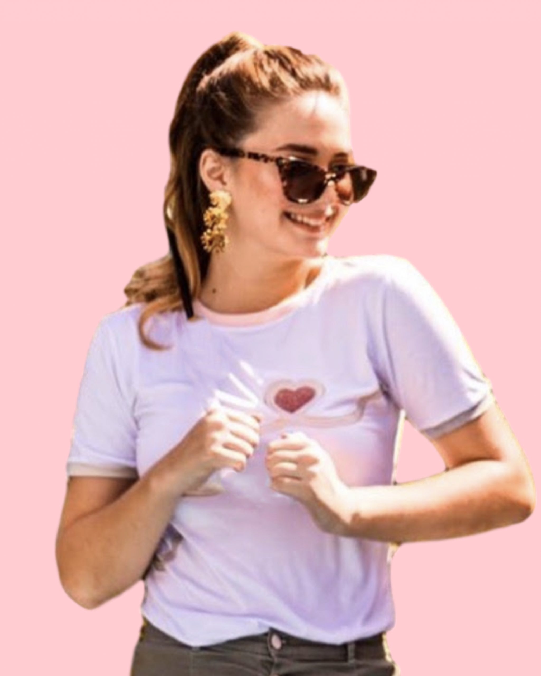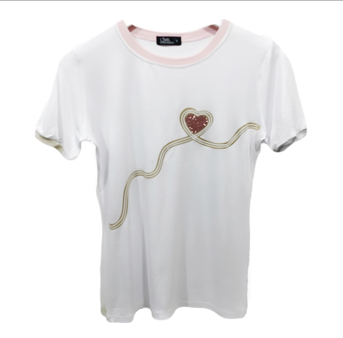 Camiseta de viscosa y spandex, color blanca y filos de manga en colores beige y gris y cuello redondo rosado, con diseno de vinil textil escarchado.