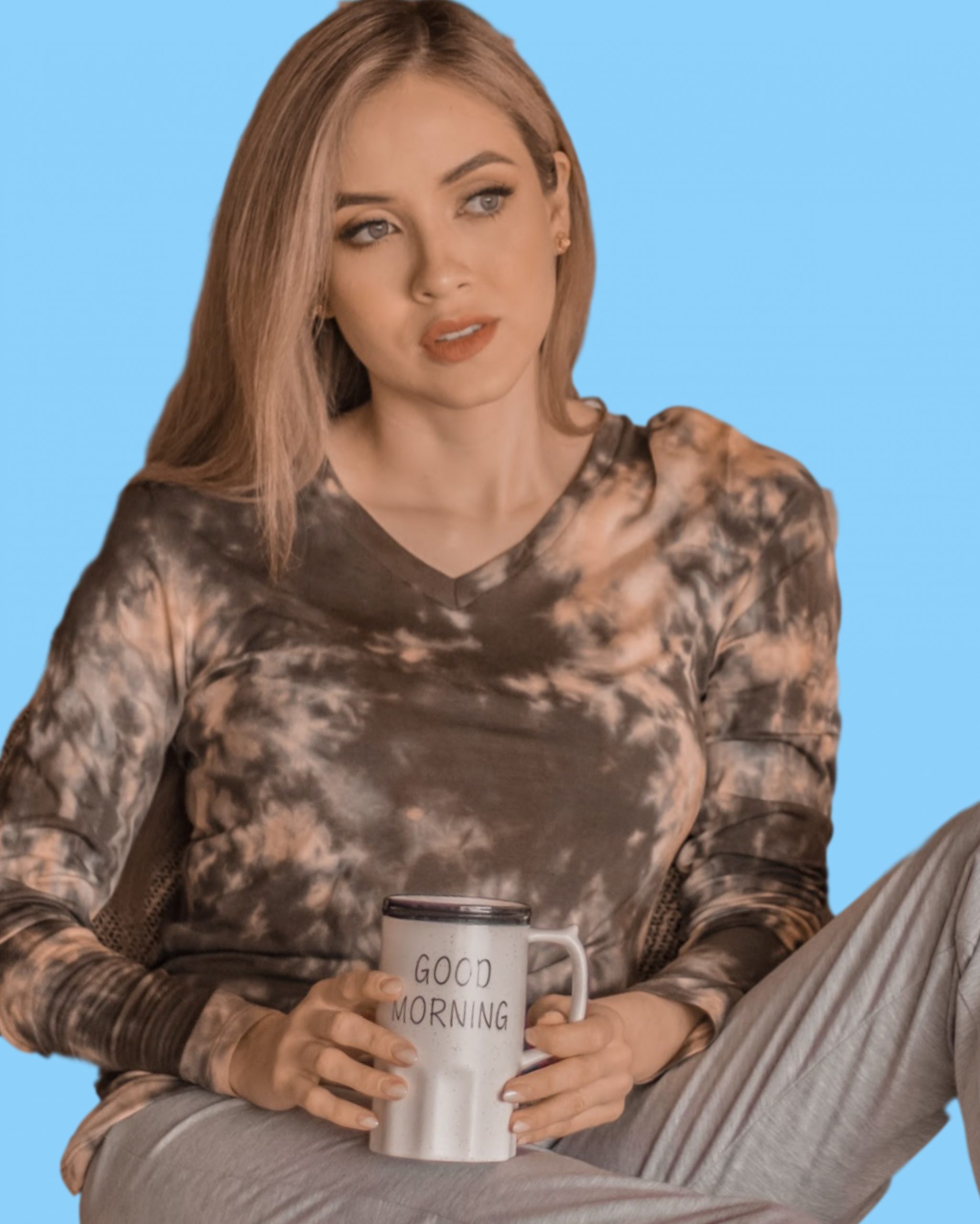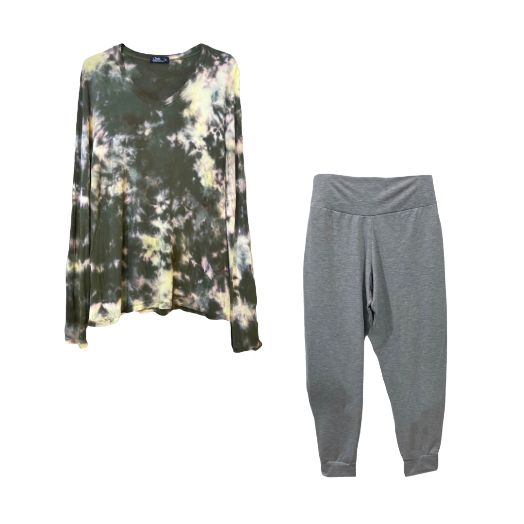 Set de Camiseta mangas largas tie dye y jogger gris de viscosa y spandex, aplicación de técnica Tie Dye sobre camiseta.