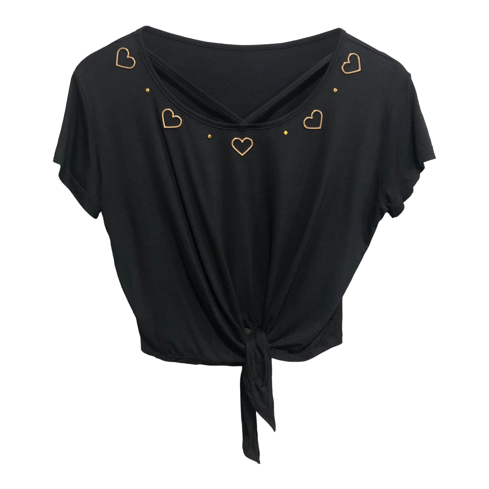 Camiseta de viscosa y spandex, cuello redondo y con 2 tiras adelante y nudo amarrada en cintura, con tachuelas en forma de corazón doradas de metal.
