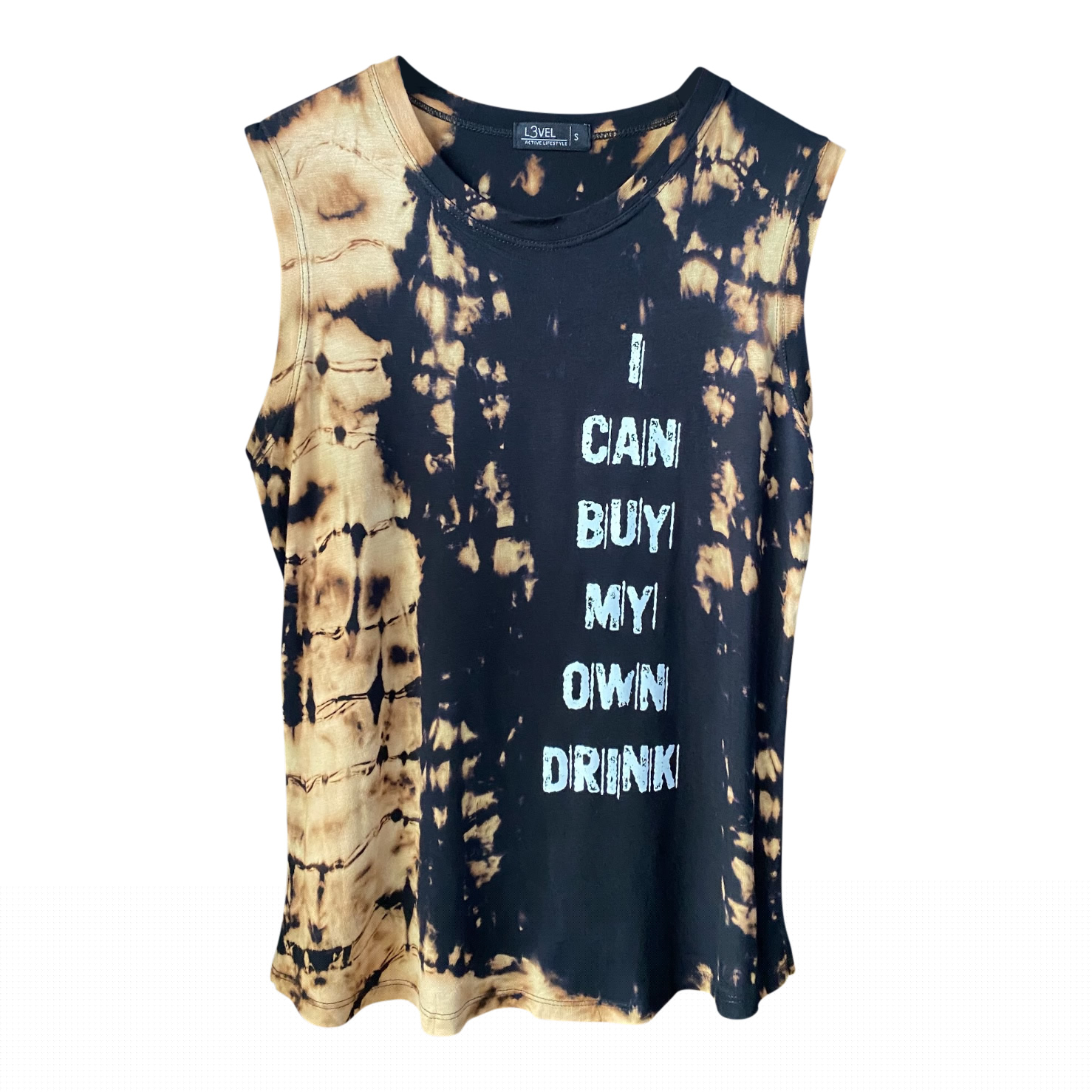 Camiseta de viscosa y spandex, cuello redondo y sin mangas, aplicación de técnica Tie Dye sobre negro y diseno de vinil textil.