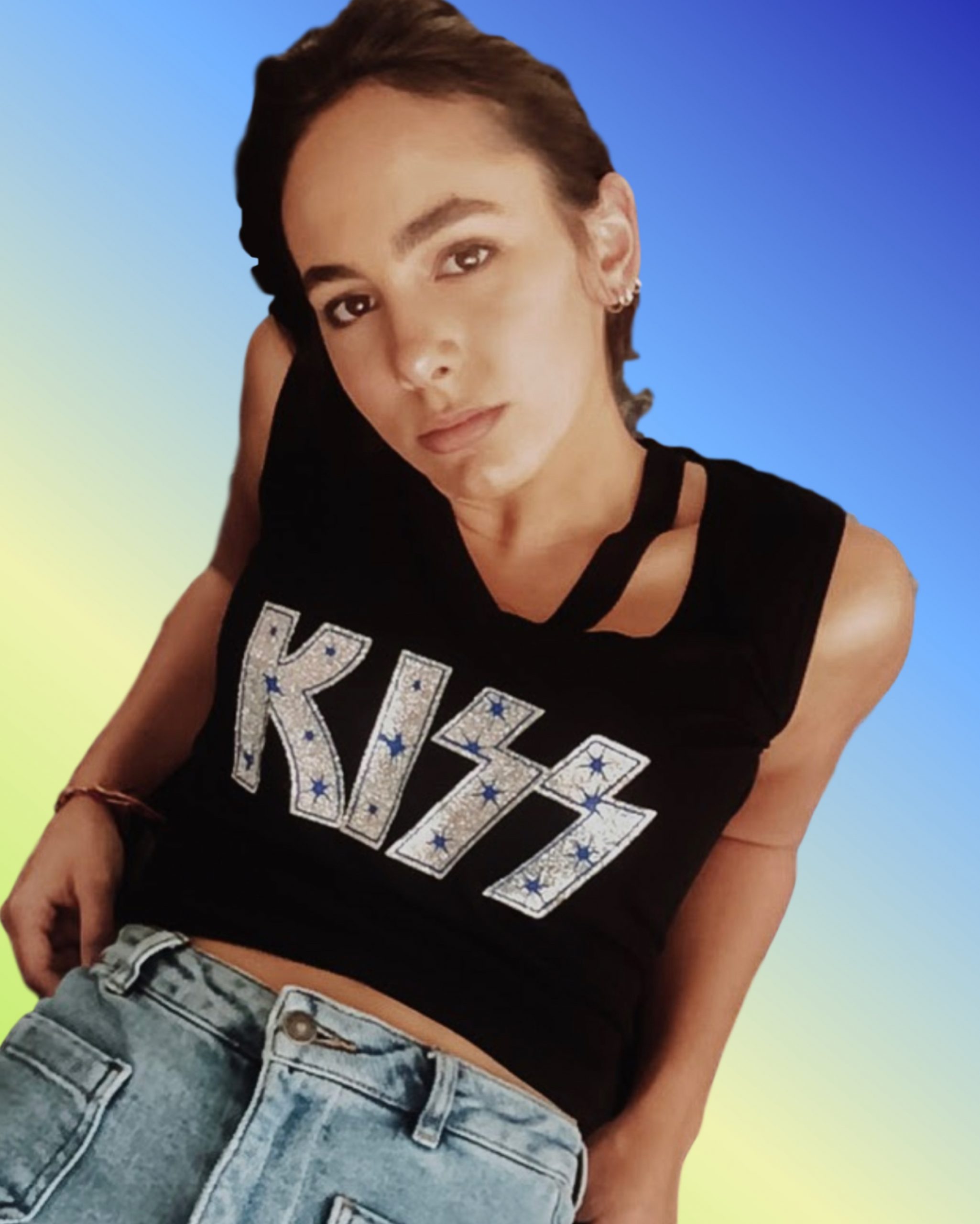 Camiseta de viscosa y spandex, sin mangas con cuello en V y roto a un lado, con diseno de vinil textil plateado escarchado.