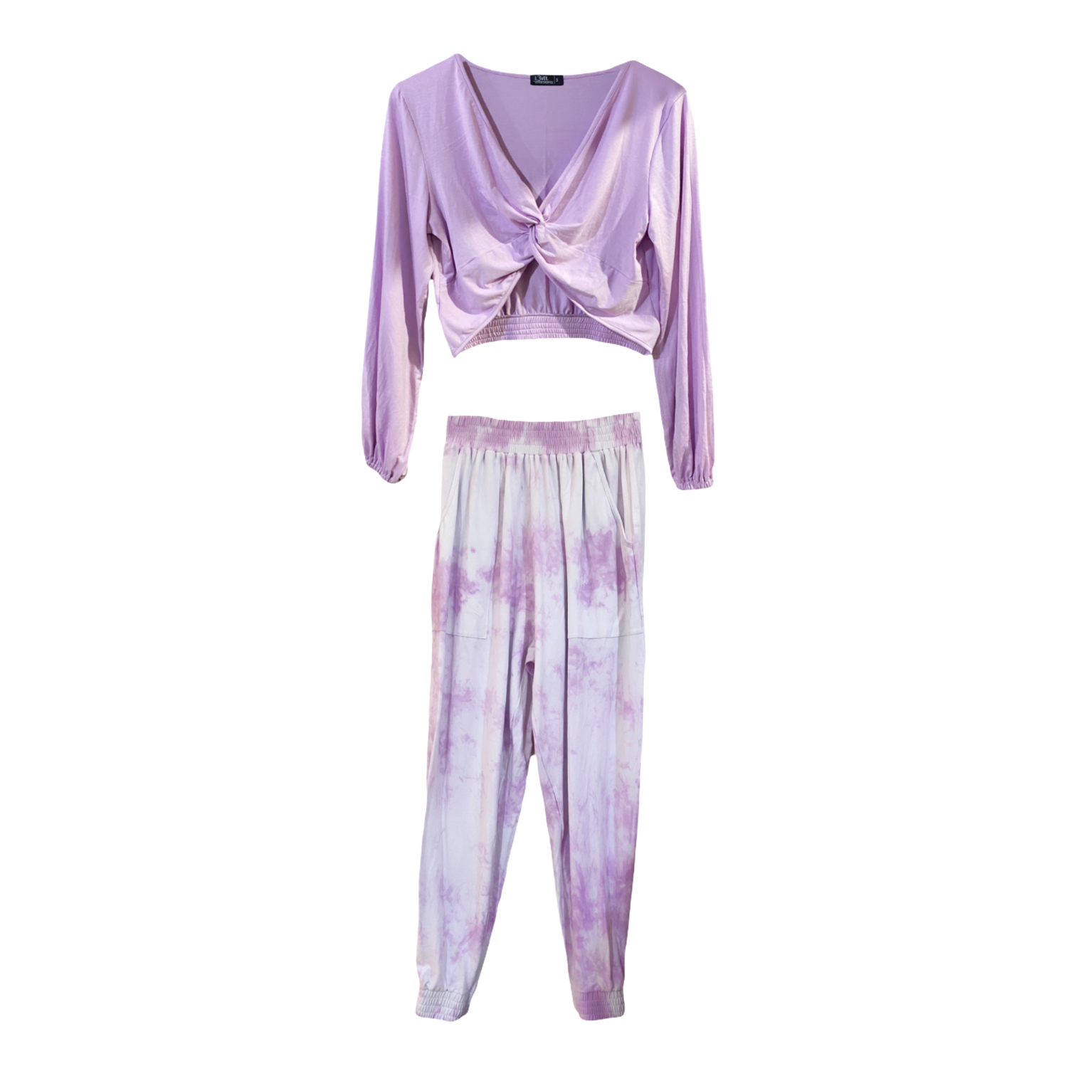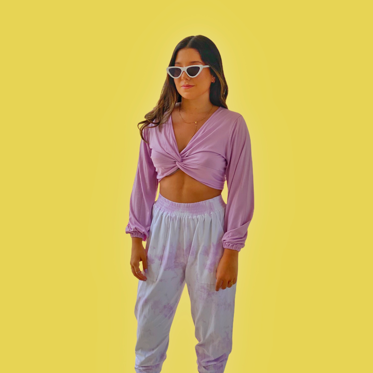 Set de crop top color lavanda y jogger  con aplicación de técnica Tie Dye en tonos lavanda.