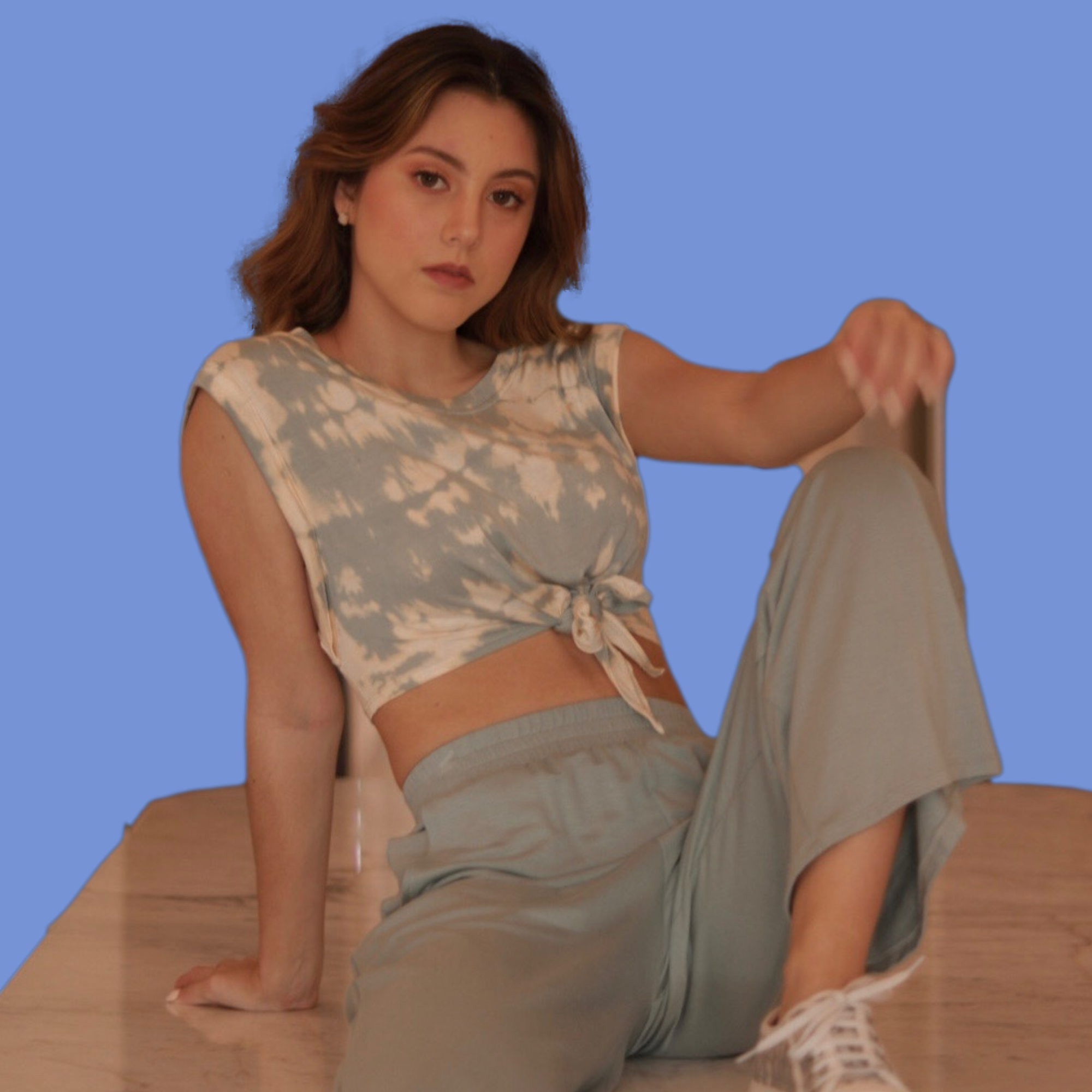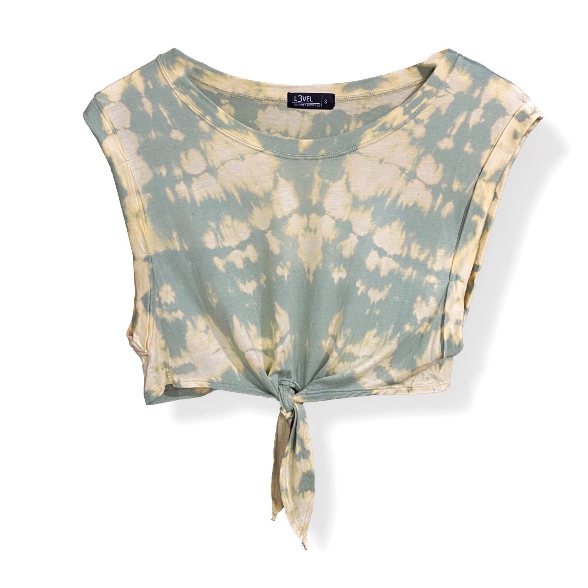 Camiseta corta de viscosa y spandex, sin mangas, cuello redondo y con nudo y aplicación de técnica Tie-Dye.