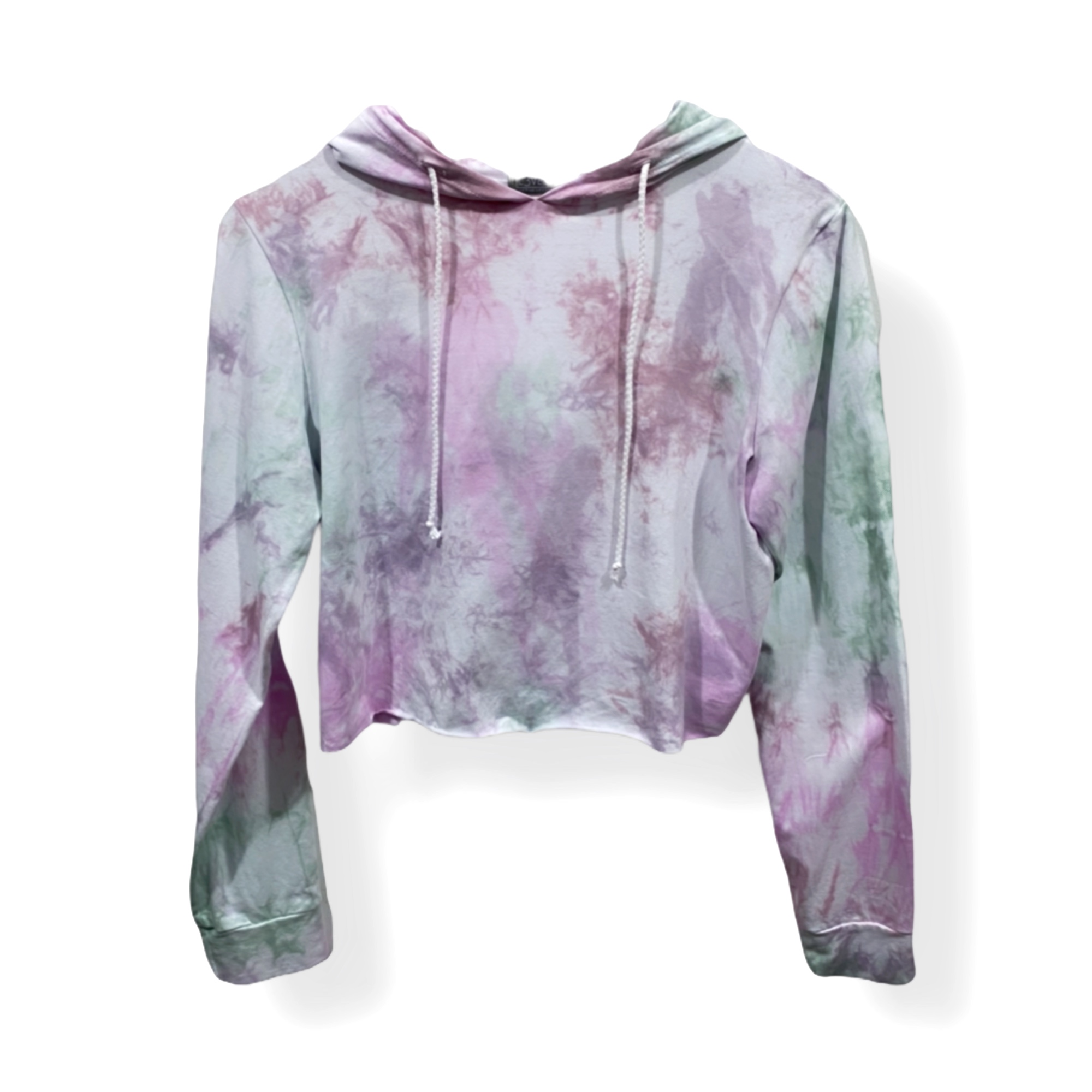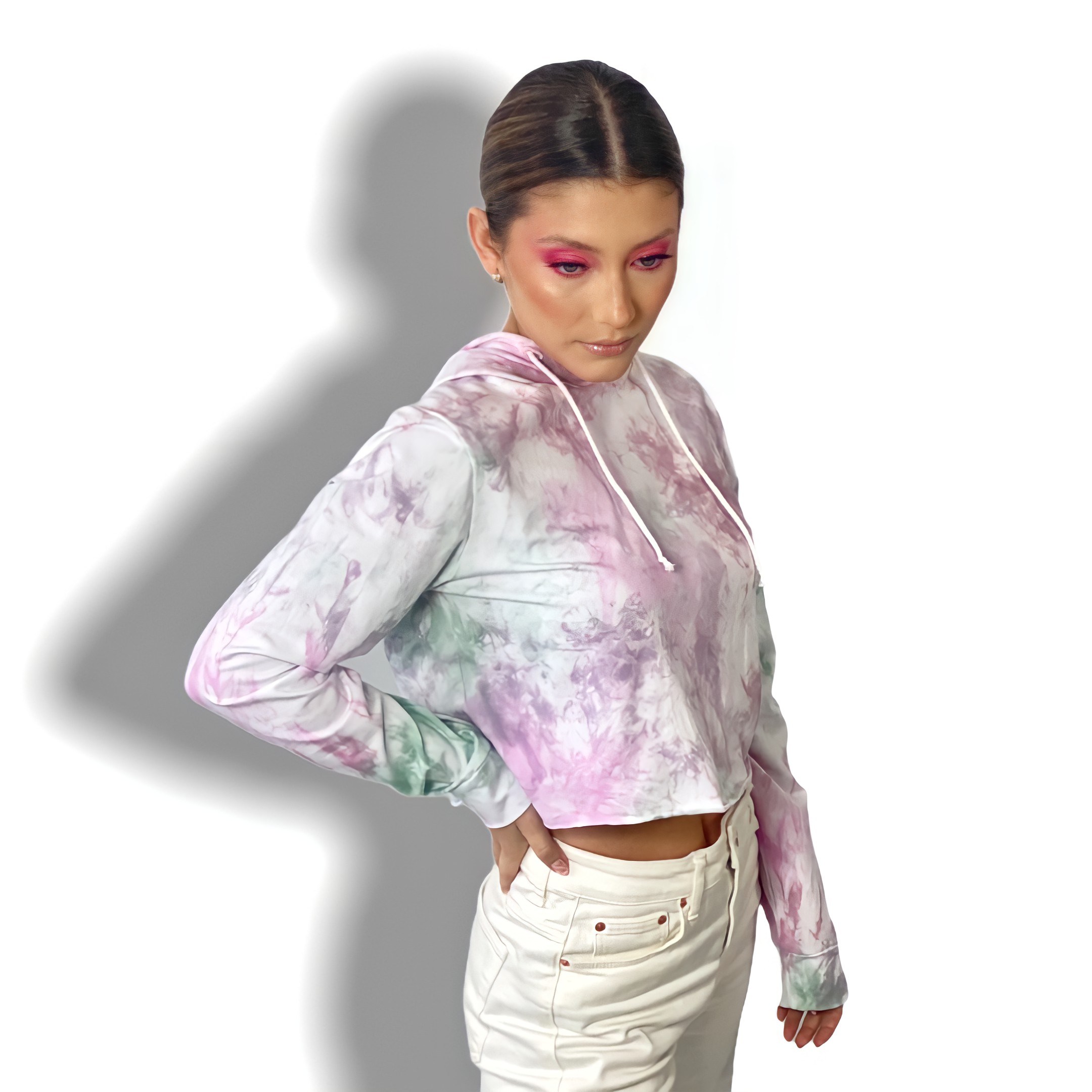 Hoodie corto Oversize de algodón, con aplicación de técnica Tie Dye en tonos rosados y verdes.