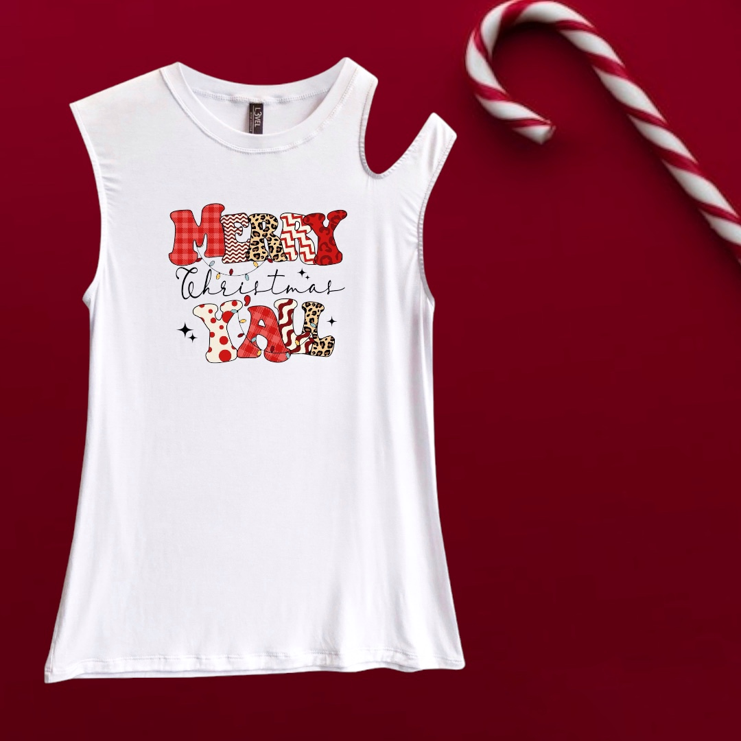 Camiseta de viscosa y spandex, sin mangas, cuello redondo y escote en hombro, con diseño de vinil textil.
