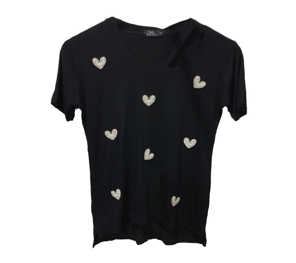 Camiseta de viscosa y spandex, con mangas con cuello en V y roto a un lado, con apliques de corazón bordados con perlas y brillos.