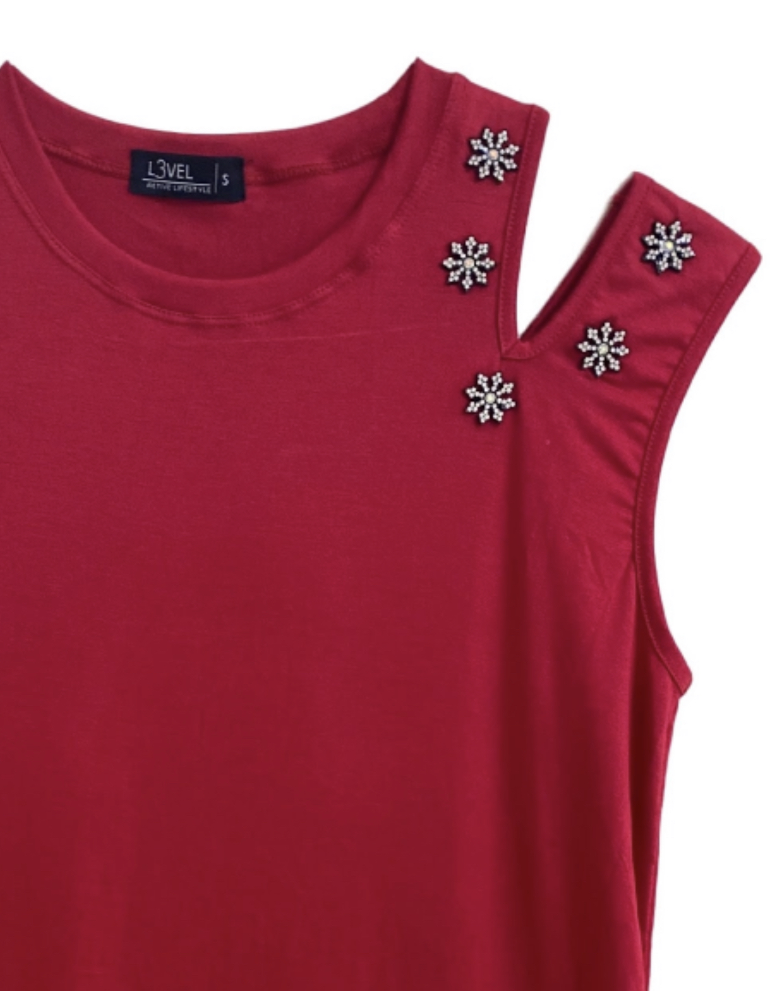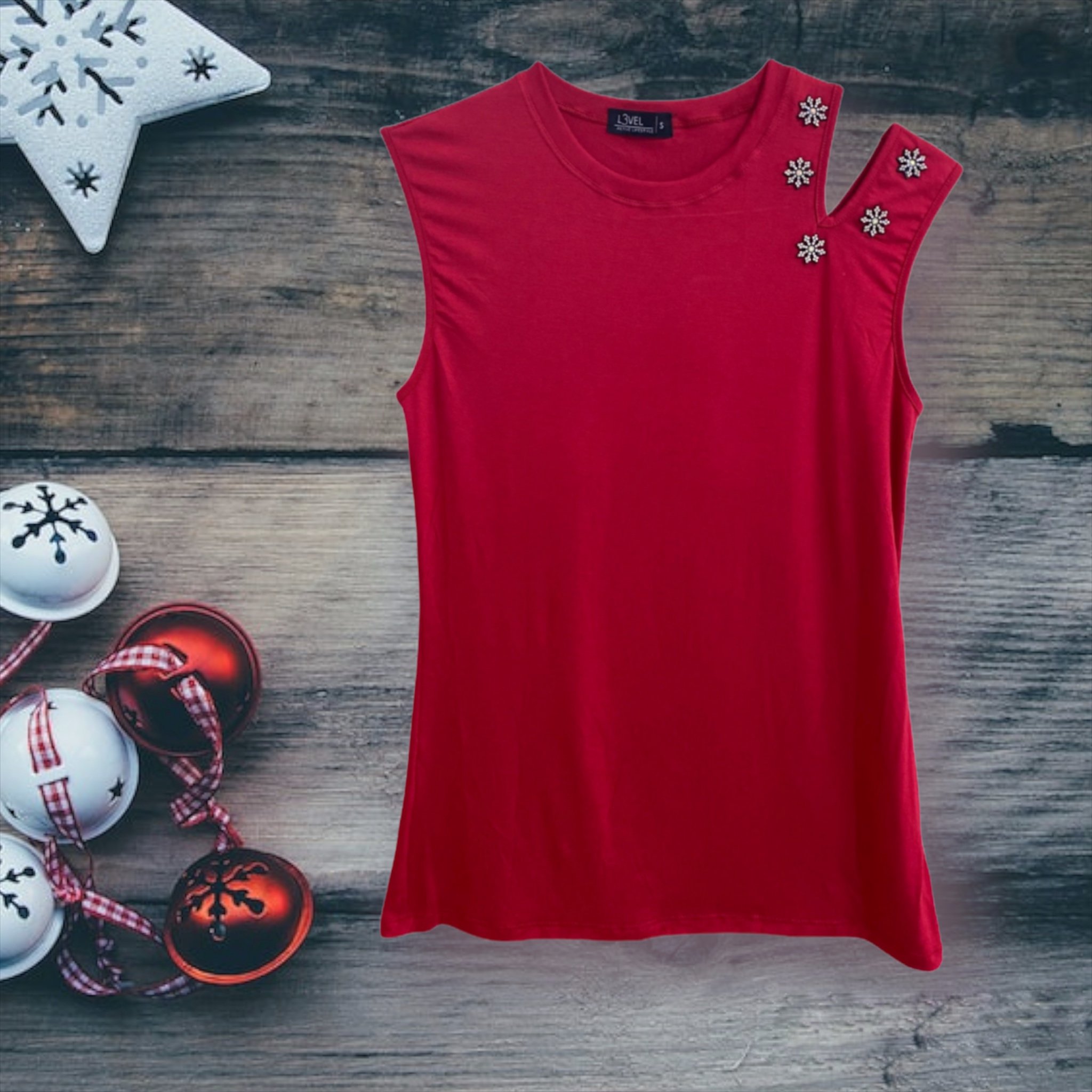 Camiseta de viscosa y spandex, sin mangas, cuello redondo y abertura en el hombro, con 5 apliques de copos de nieve de brillos.