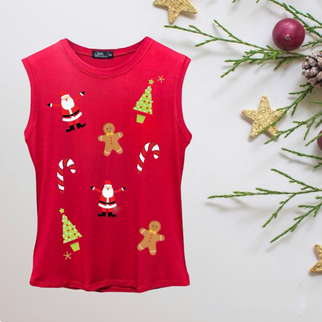 Camiseta de viscosa y spandex, sin mangas, cuello redondo con diseño de vinil textil.