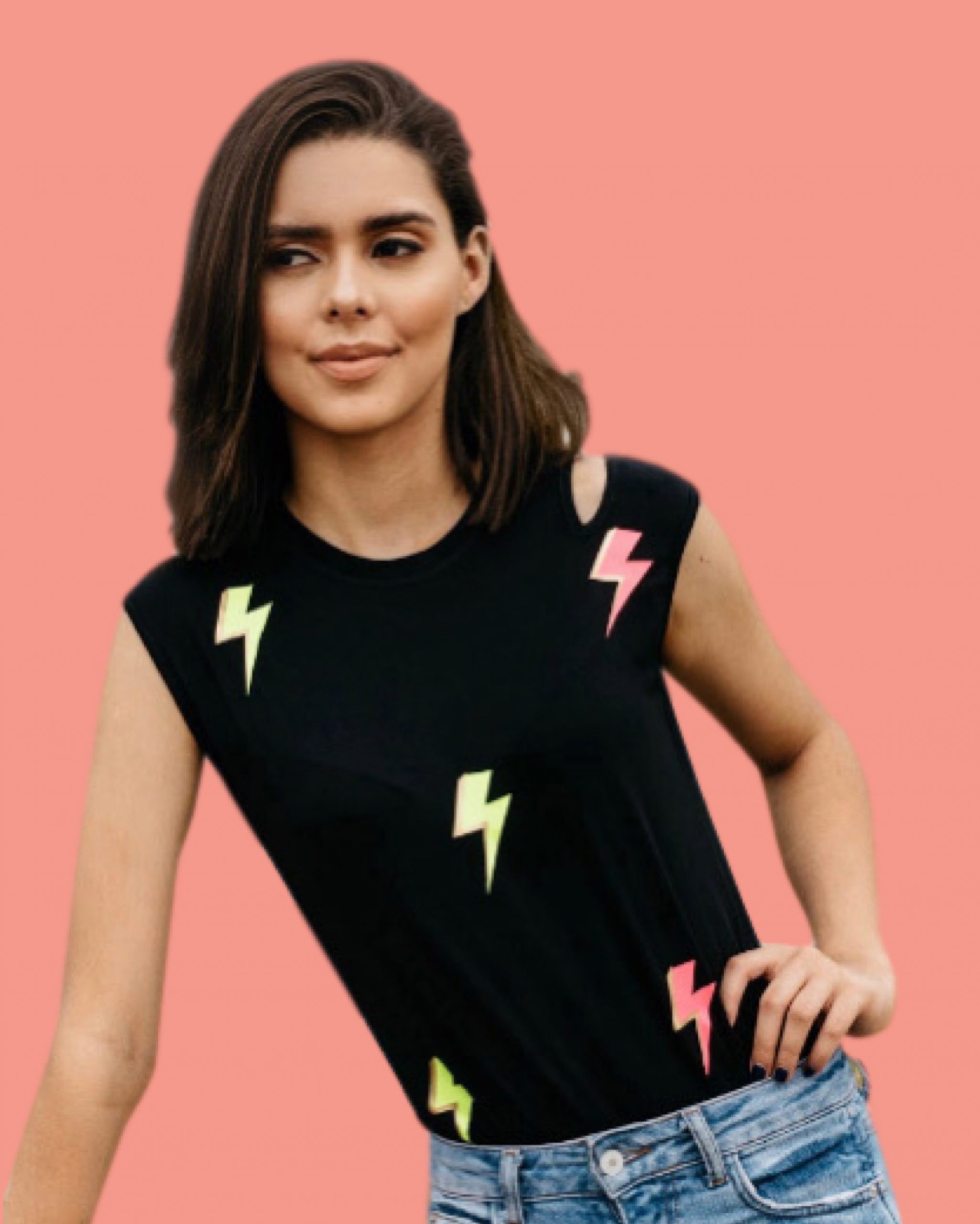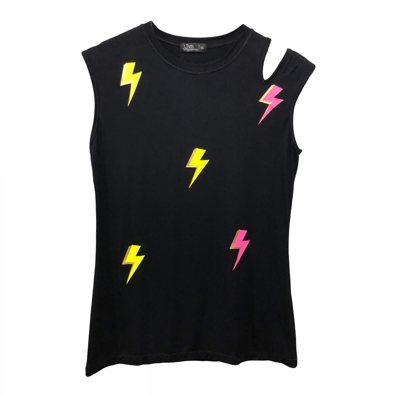 Camiseta de viscosa y spandex, sin mangas, cuello redondo y abertura en el hombro, con diseno en vinil textil de rayos color neon.