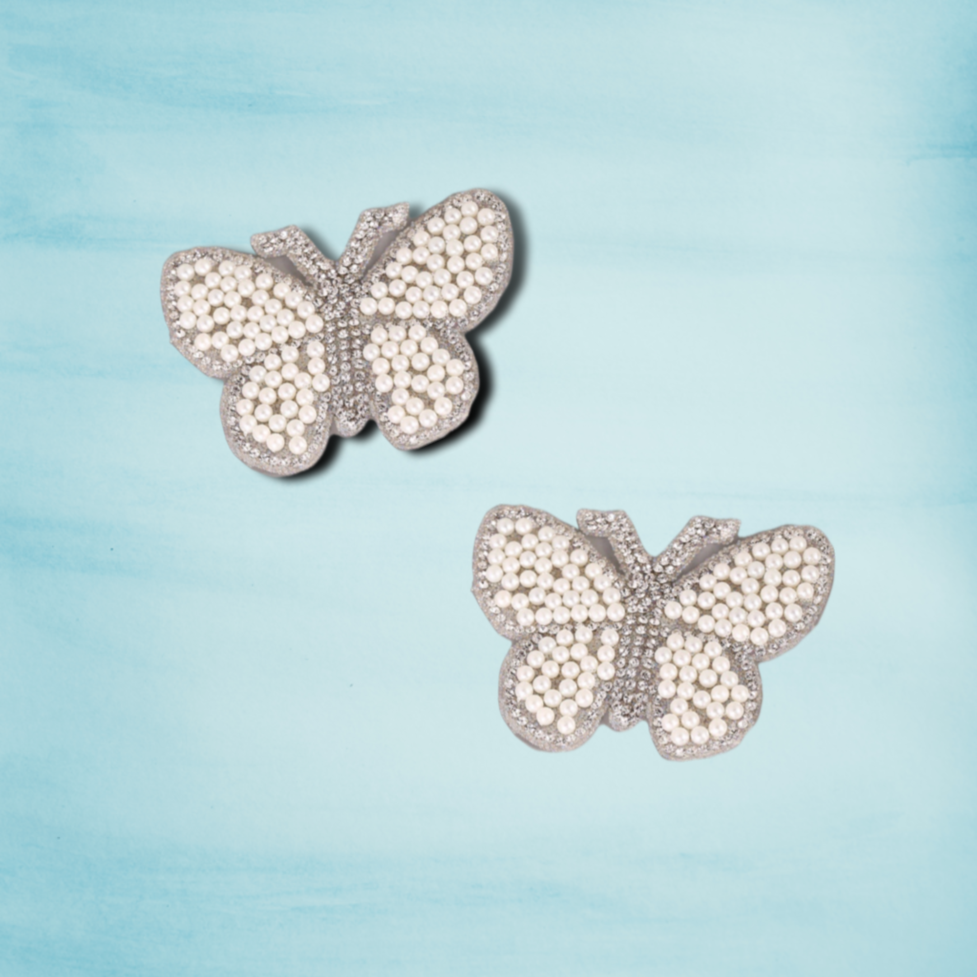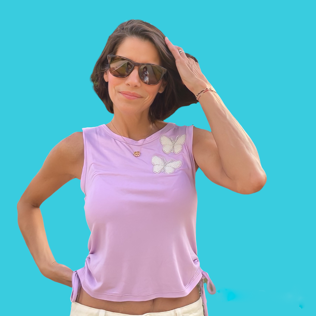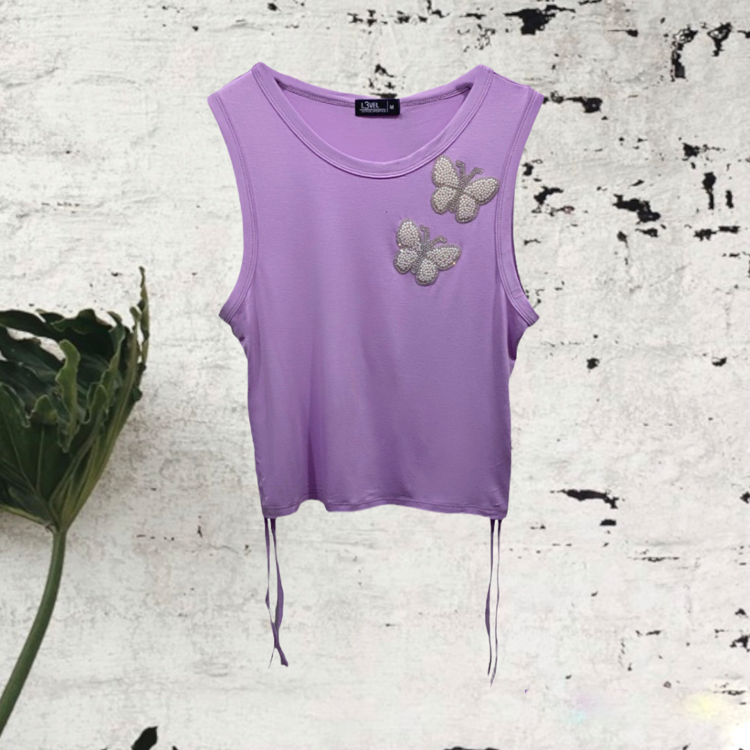Camiseta de viscosa y spandex, sin mangas, cuello redondo, ajustable a los lados y dos apliques de mariposas bordados con perlas.
