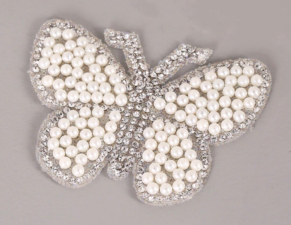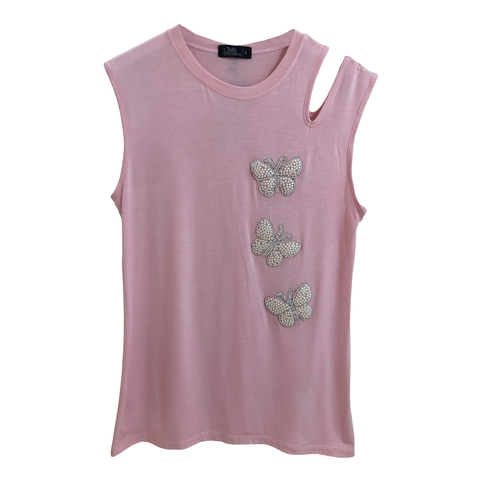 Camiseta de viscosa y spandex, sin mangas, cuello redondo y abertura en el hombro, con apliques de mariposas de perlas y brillos.