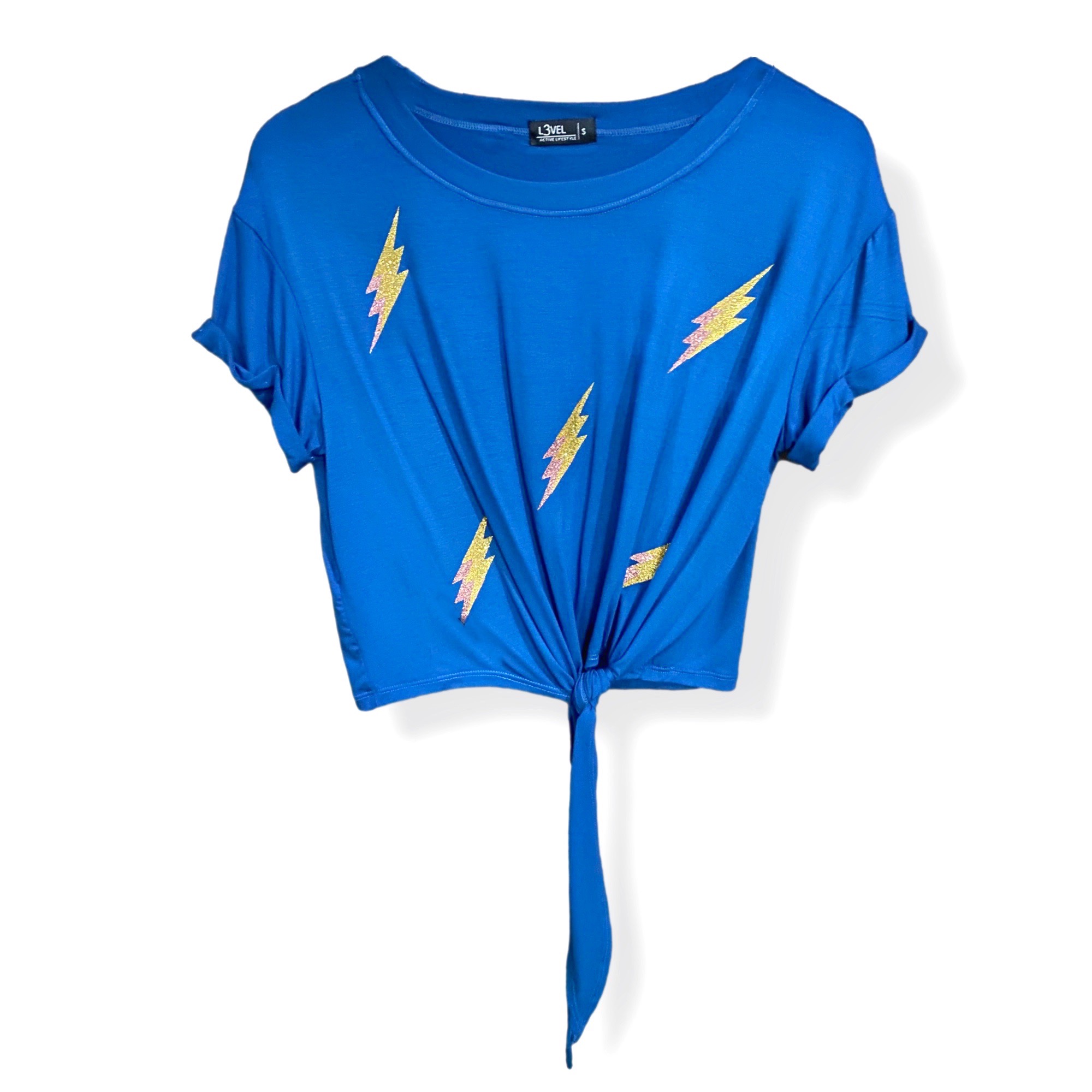 Camiseta de viscosa y spandex, con mangas, cuello redondo y nudo adelante y a un lado, con diseno de vinil textil glitter.