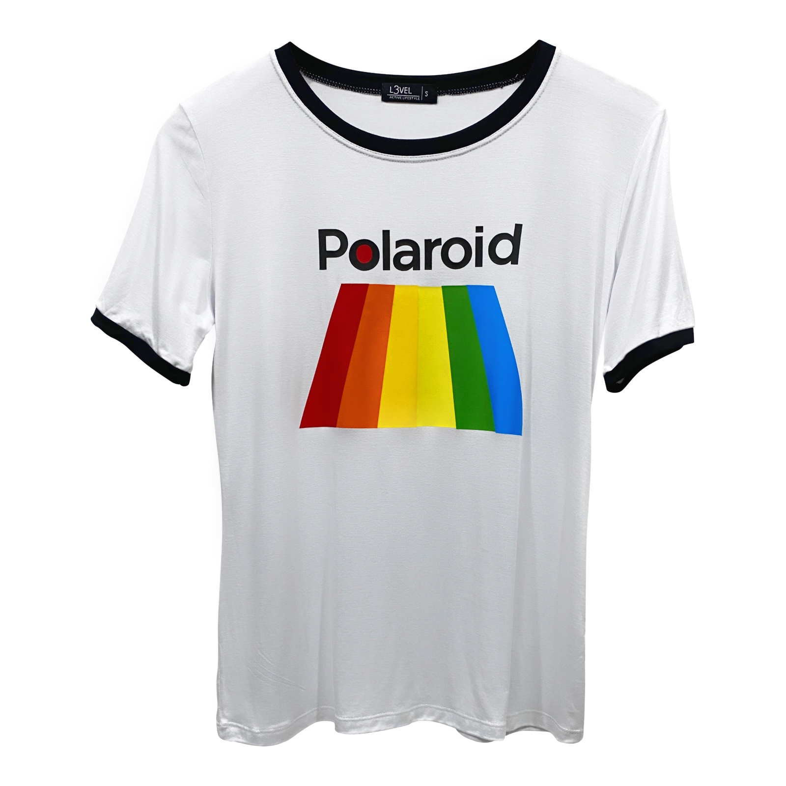 Camiseta de viscosa y spandex, color blanca y filos de manga color negro y cuello redondo negro, con diseno de vinil textil.