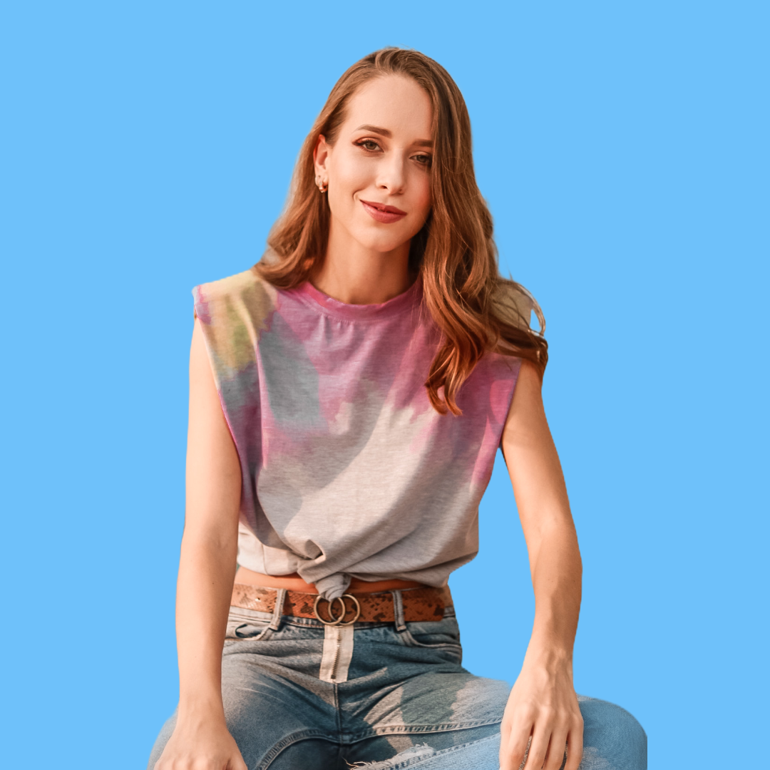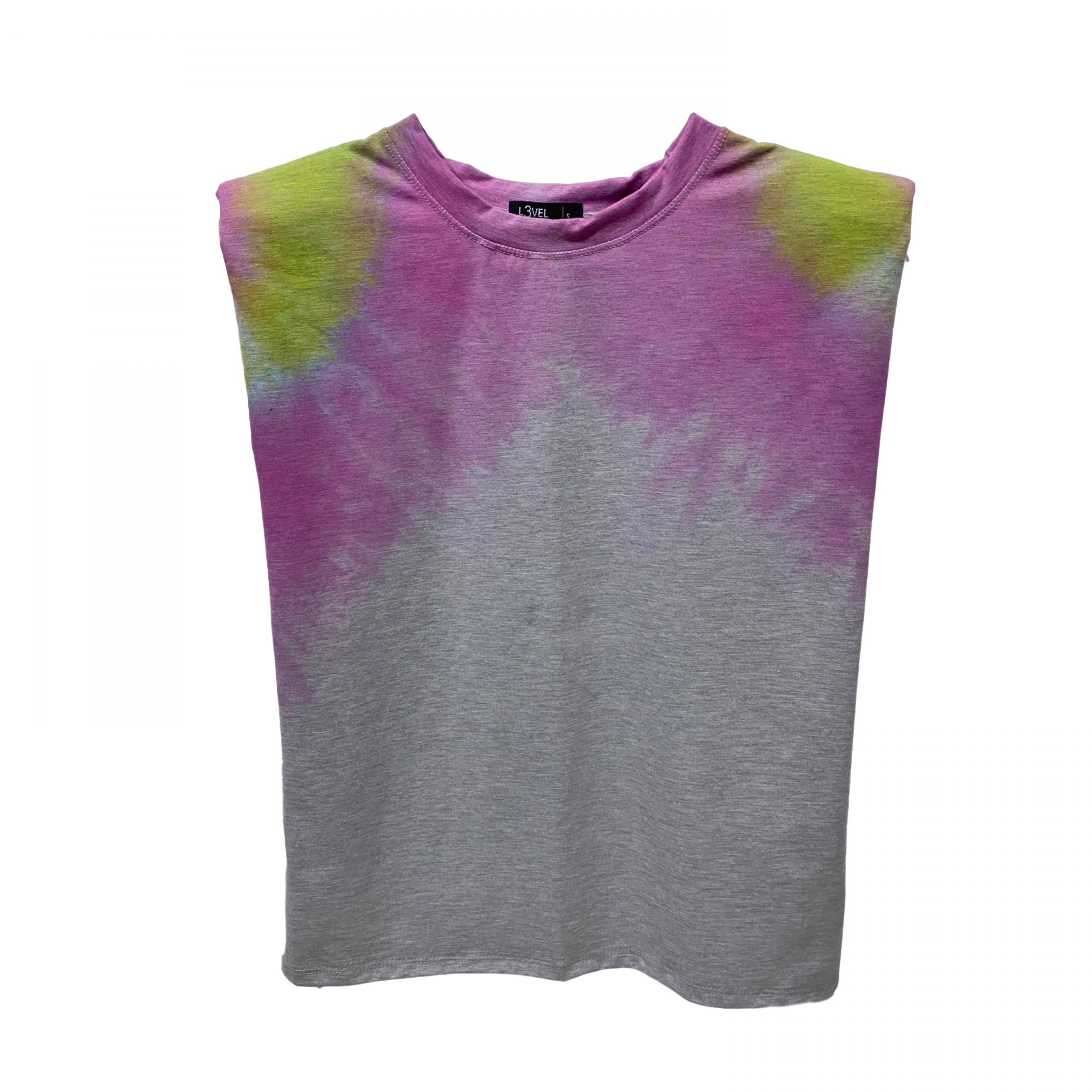 Camiseta con hombreras y cuello redondo de algodón y spandex con aplicación de técnica Tie Dye en tonos morados y verdes sobre color gris.
