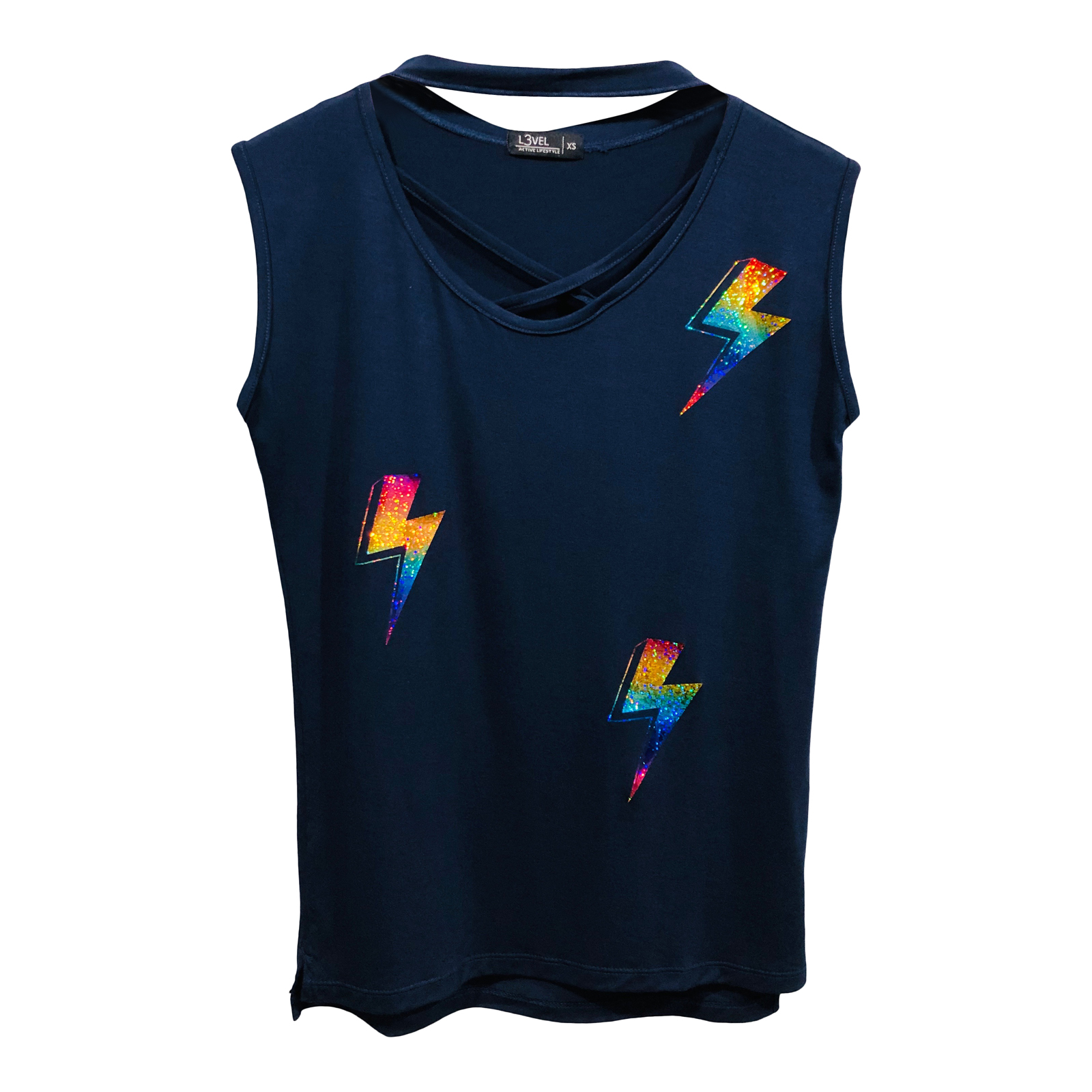 Camiseta de viscosa y spandex sin mangas y cuello choker y tiras cruzadas adelante con rayos en vinil textil escarchado de colores.