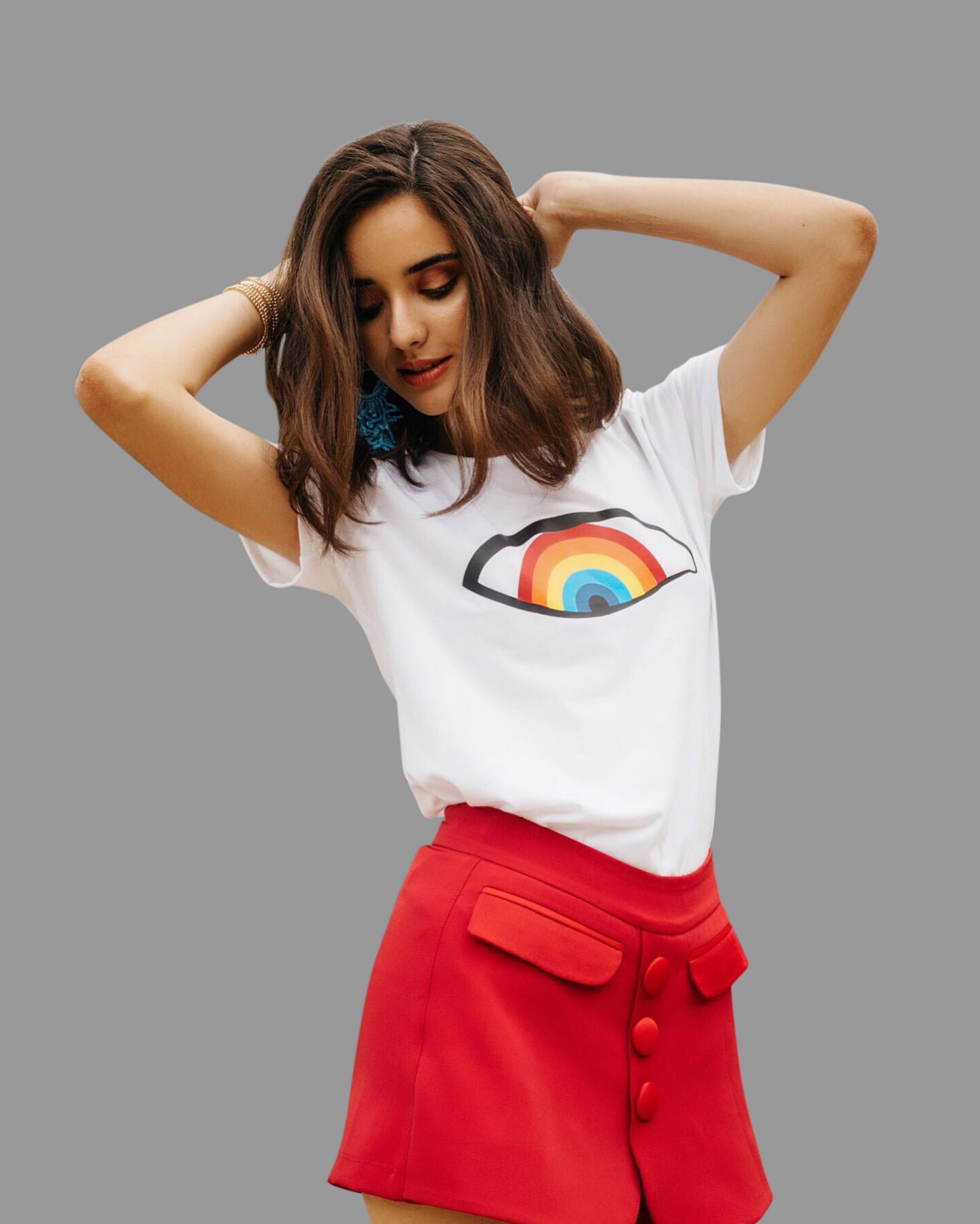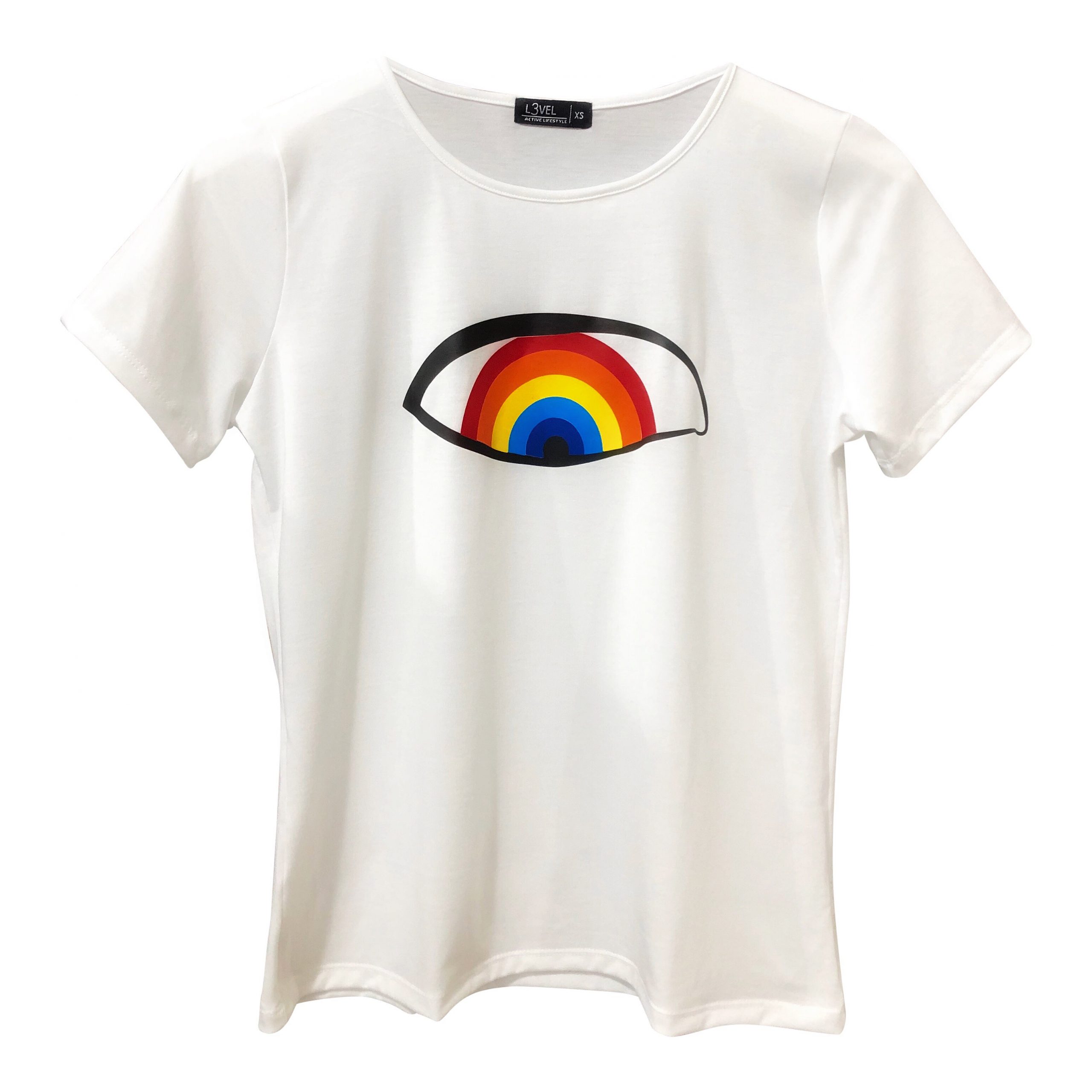 Camiseta de viscosa y spandex con mangas y diseño en vinil textil.