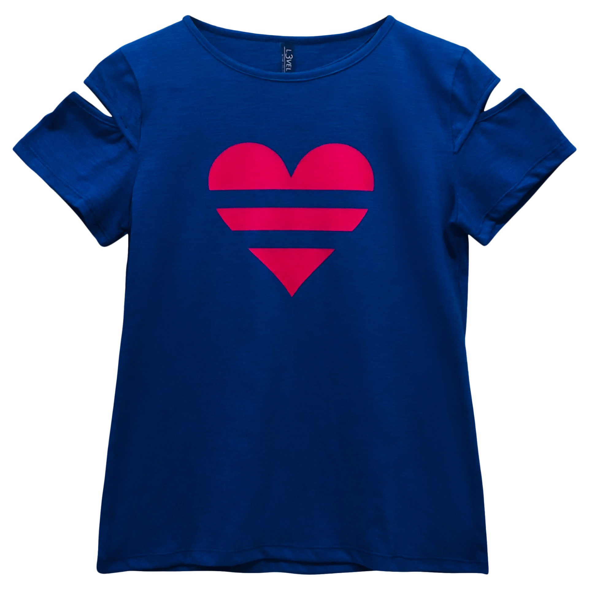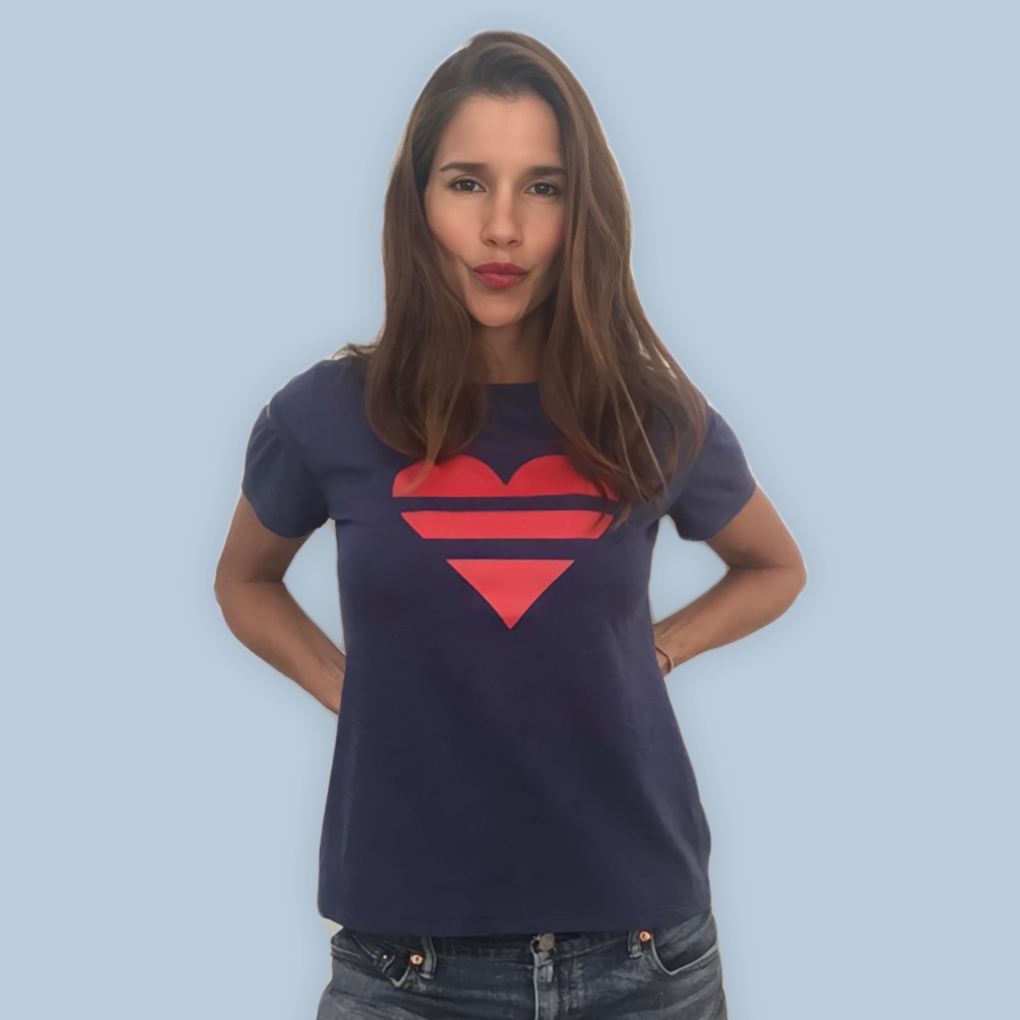 Camiseta de viscosa y spandex, con manga corta y abertura en la manga, cuello redondo con diseño rojo en vinil textil de corazón.