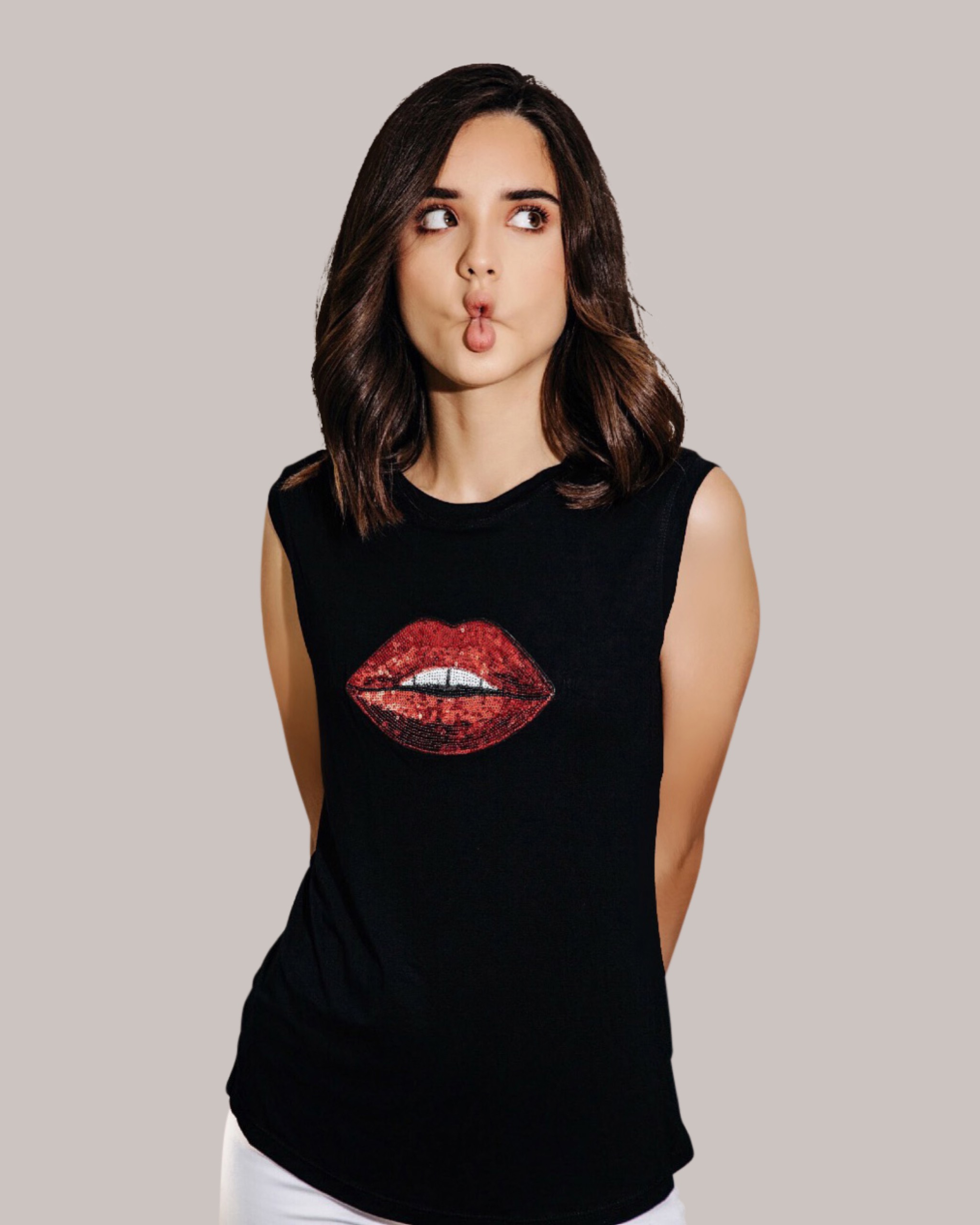 Camiseta de viscosa y spandex, sin mangas con aplique de boca roja de lentejuelas.