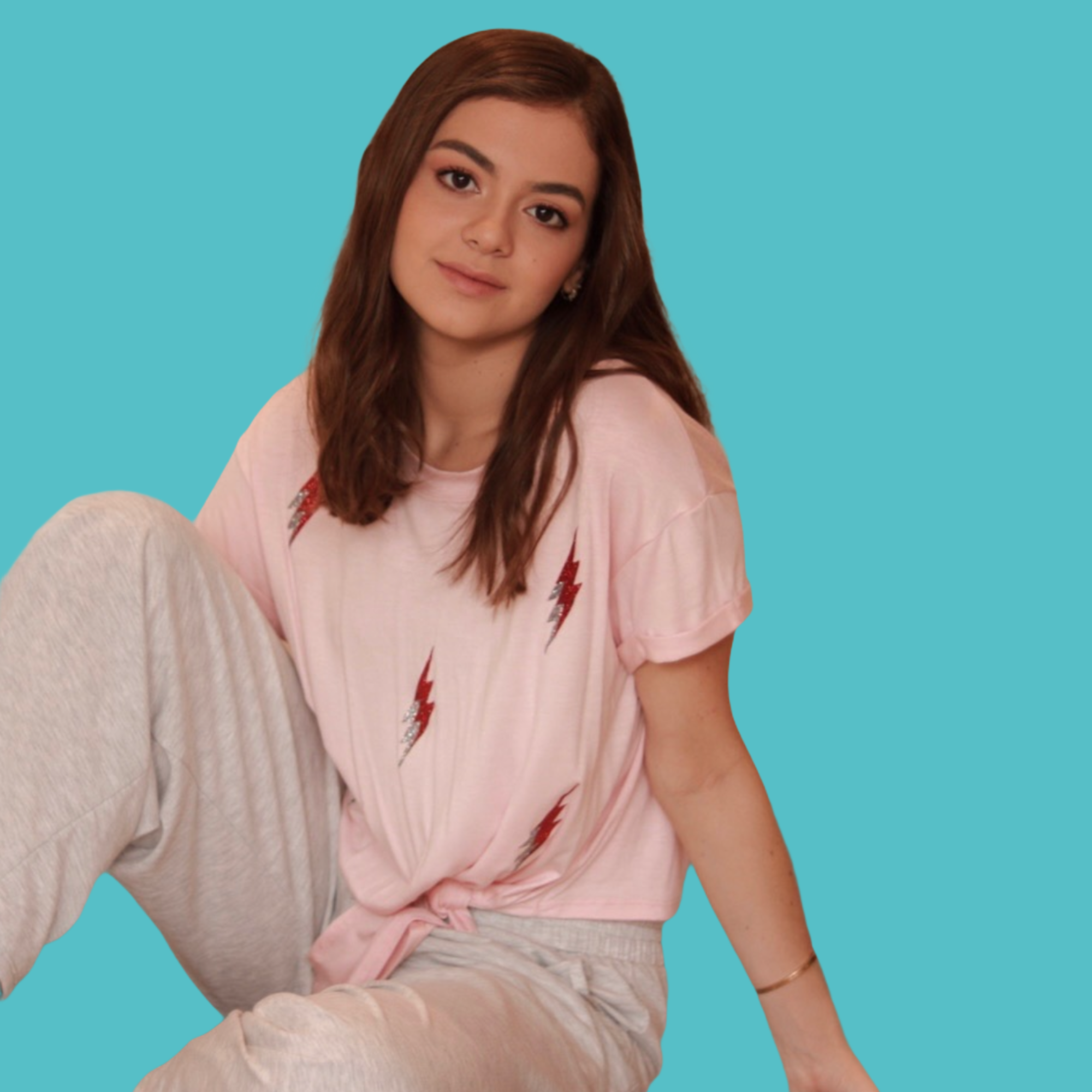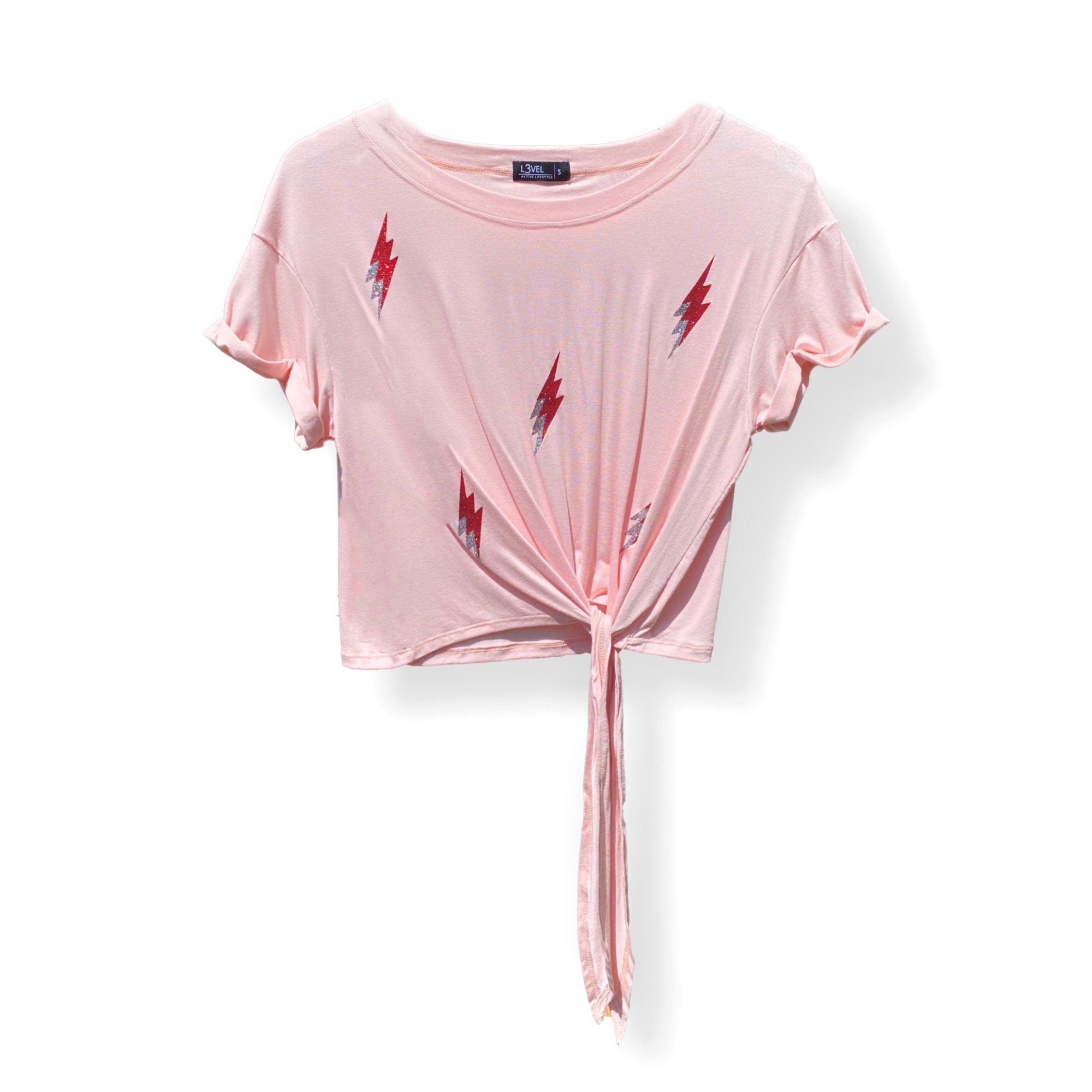 Camiseta de viscosa y spandex, con mangas, cuello redondo y nudo adelante y a un lado, con diseno de vinil textil glitter.
