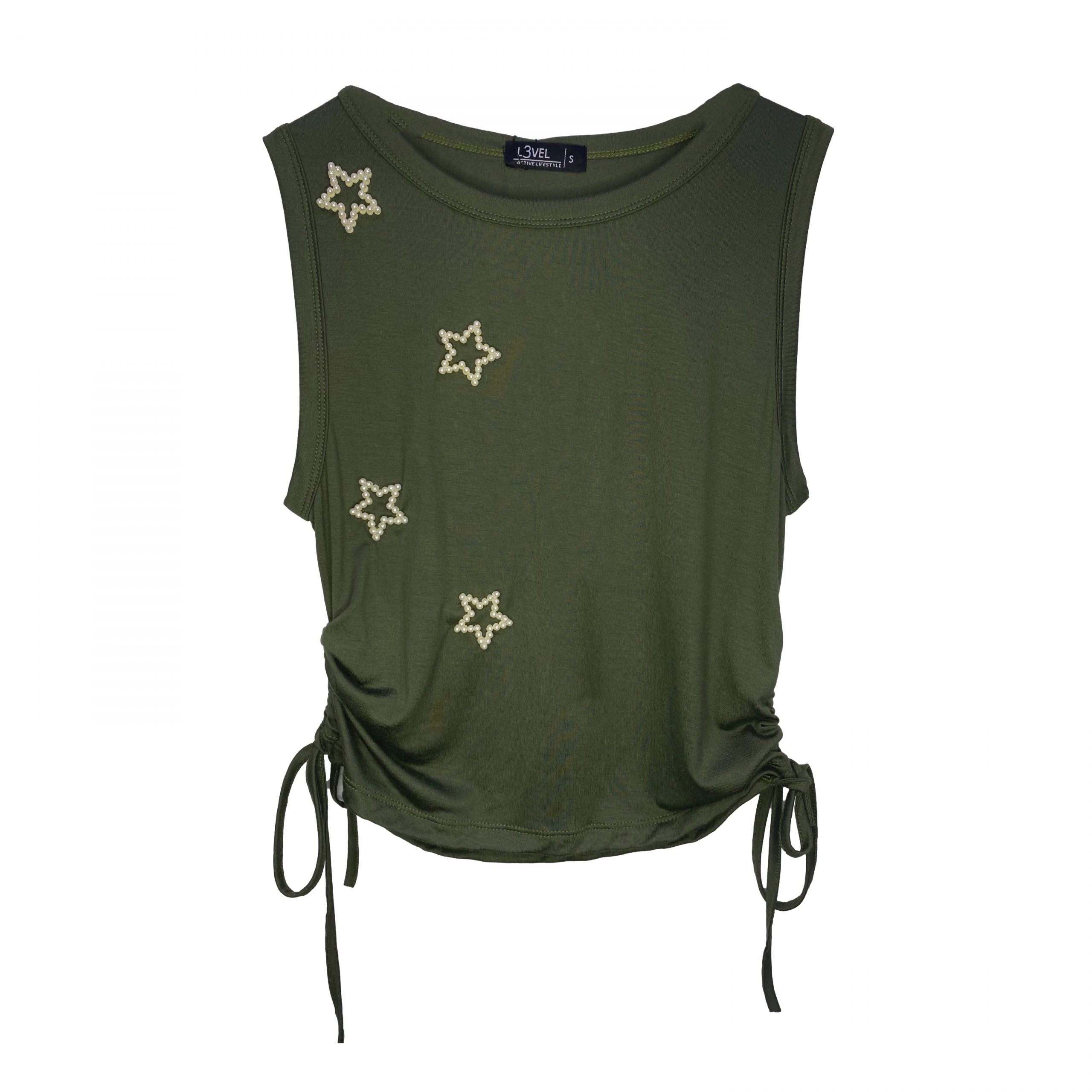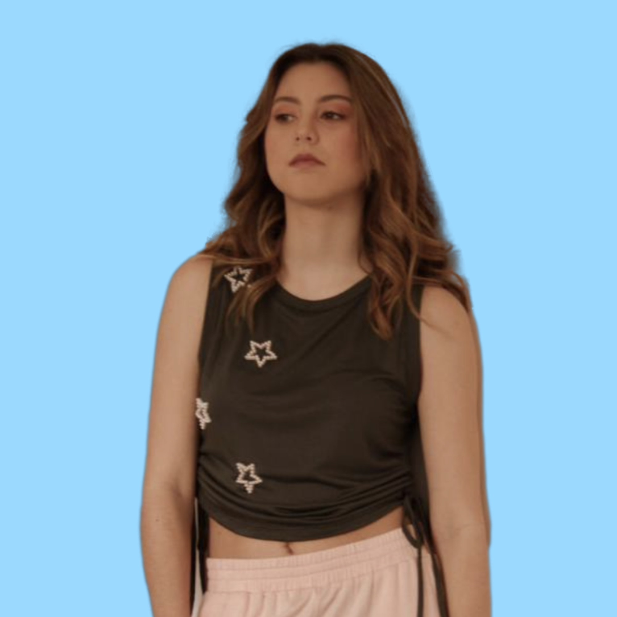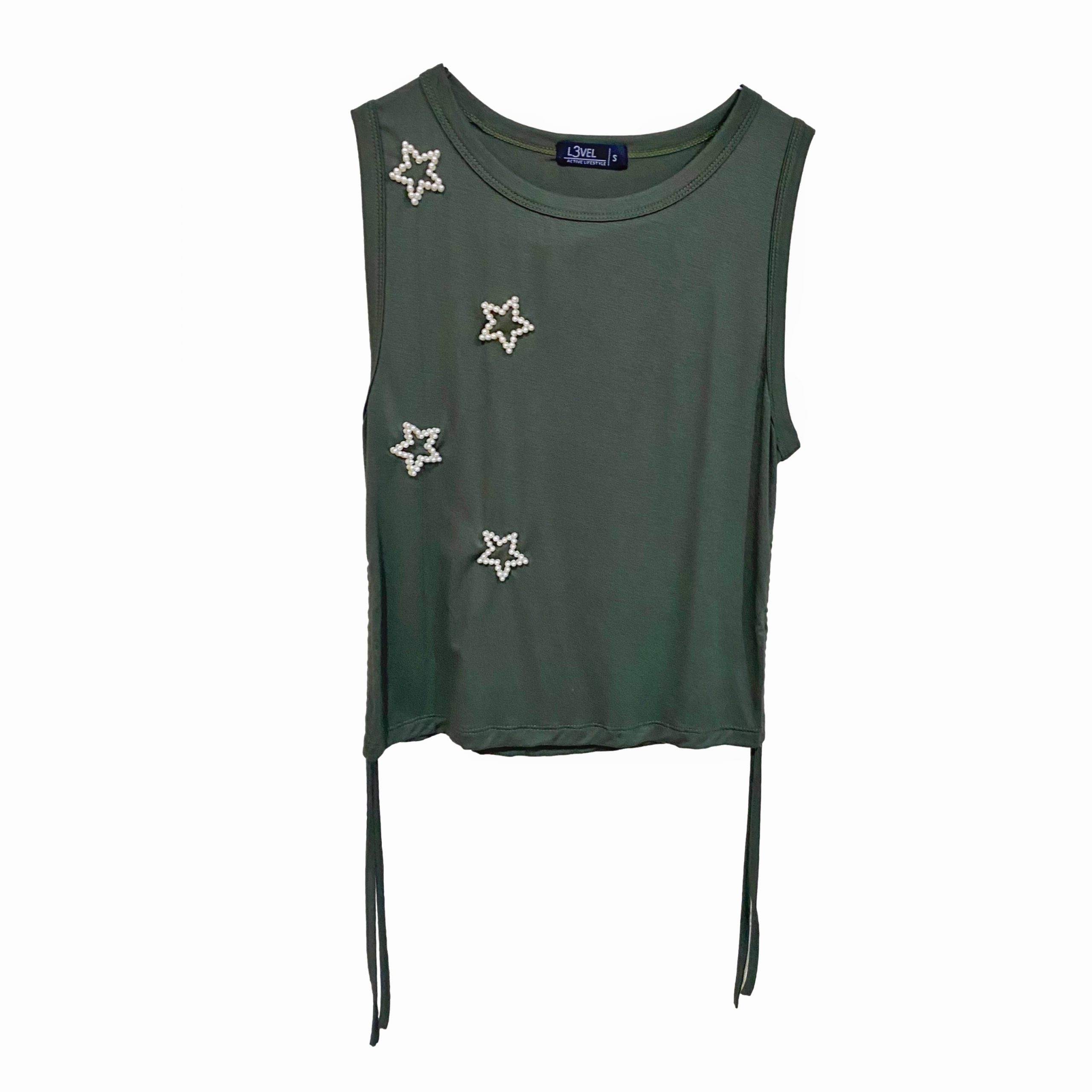Camiseta de viscosa y spandex, sin mangas, cuello redondo y que se ajusta a los lados, con 4 apliques de perlas en forma de estrellas.