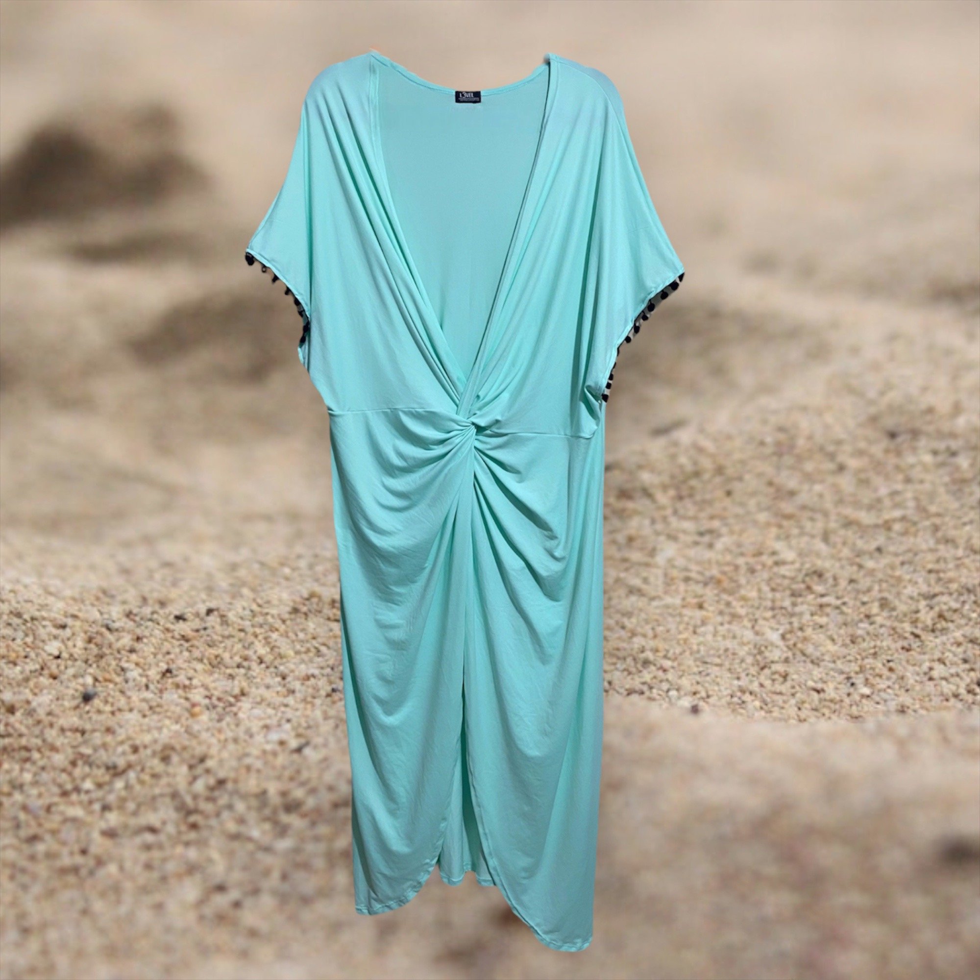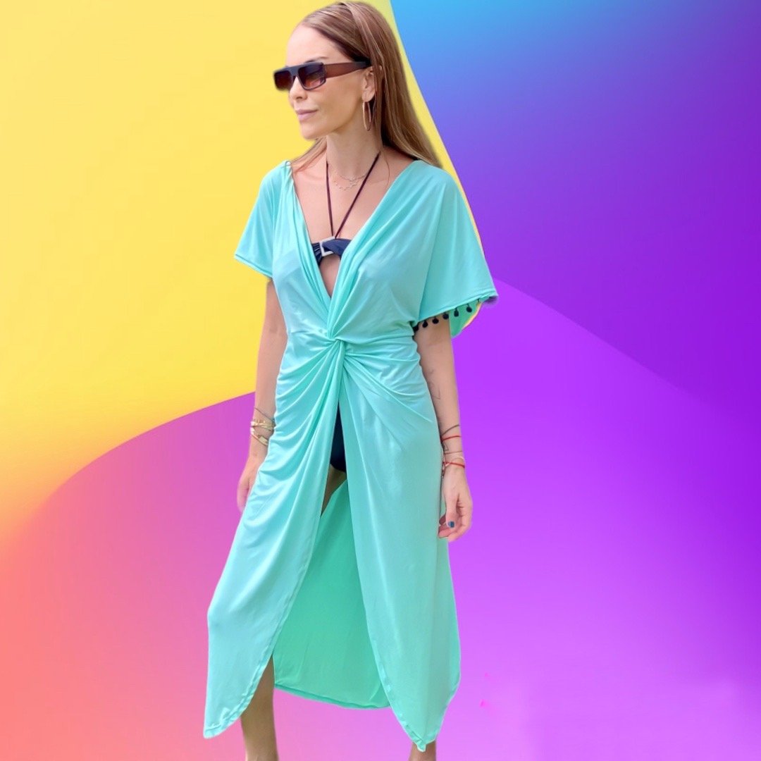 Salida de baño corta color menta, con borlas negras en las mangas y cruzada adelante con nudo.