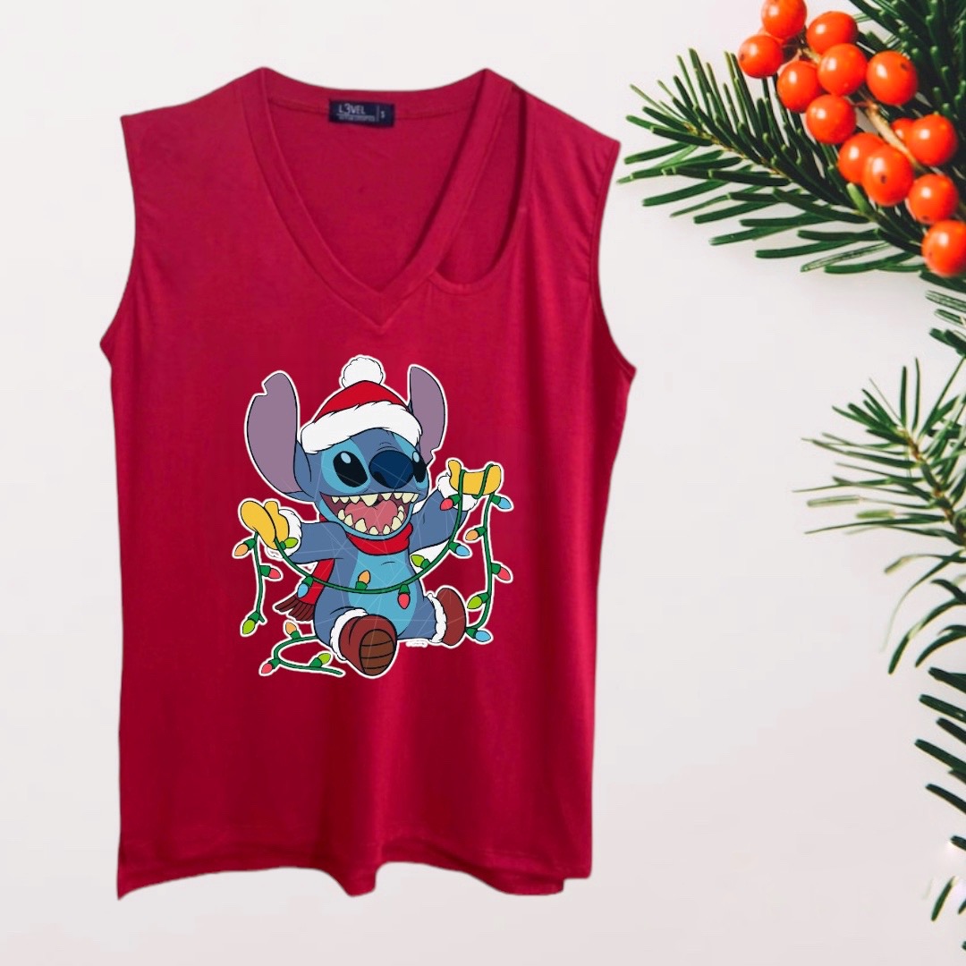 Camiseta de viscosa y spandex, sin mangas y cuello redondo con diseño de vinil textil.