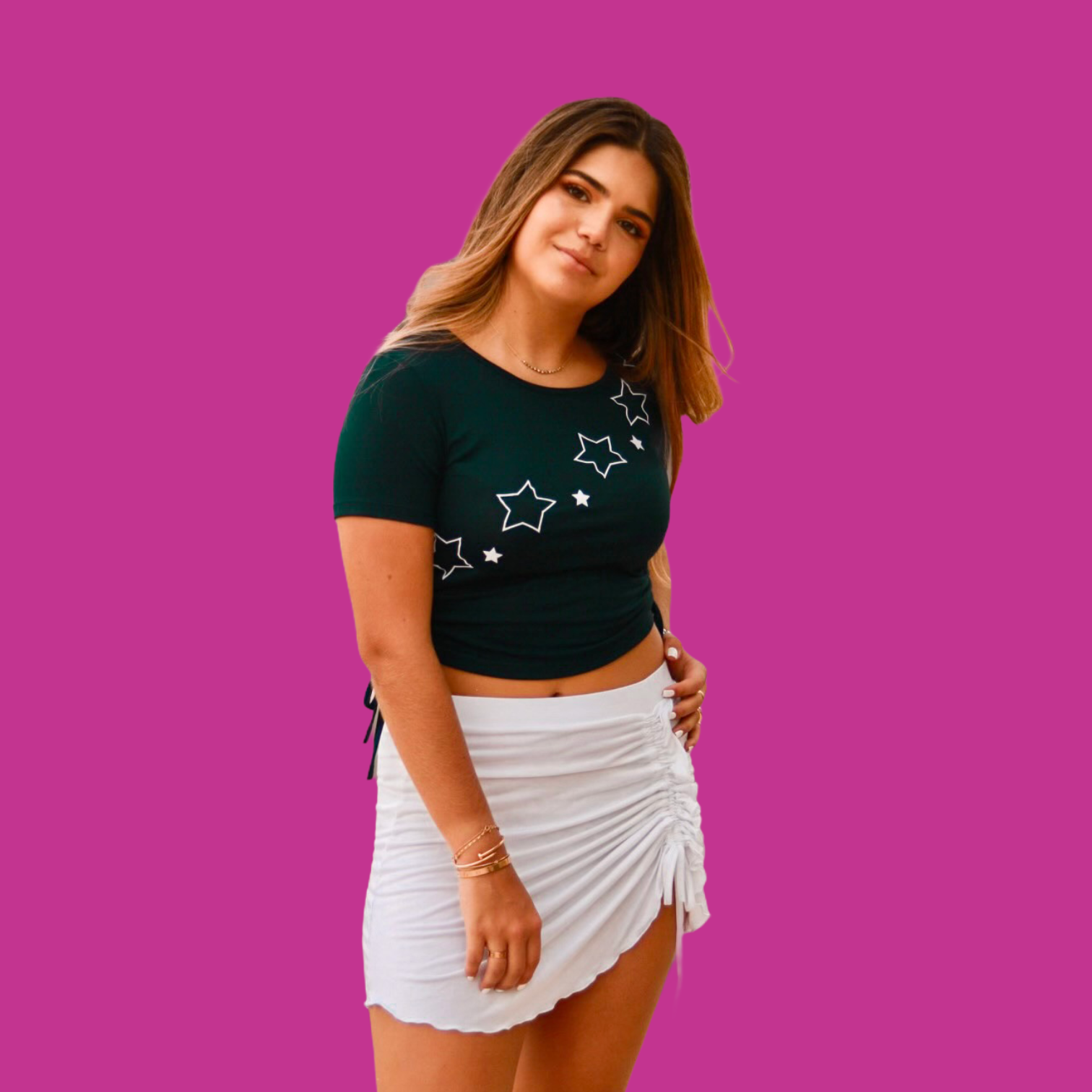 Set de crop top amarrado a los lados con diseno de estrellas con textura de terciopelo y falda corta de viscosa y spandex.