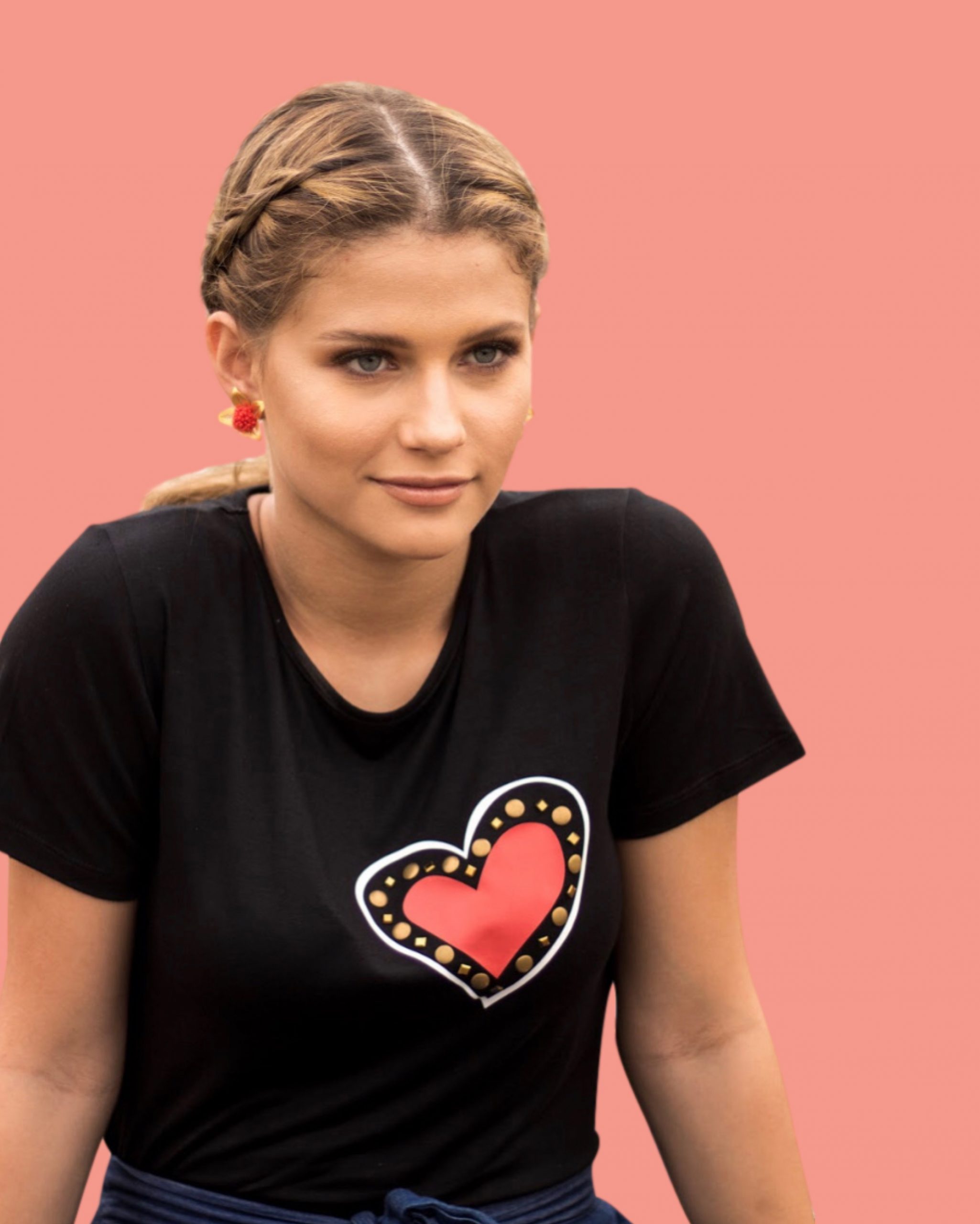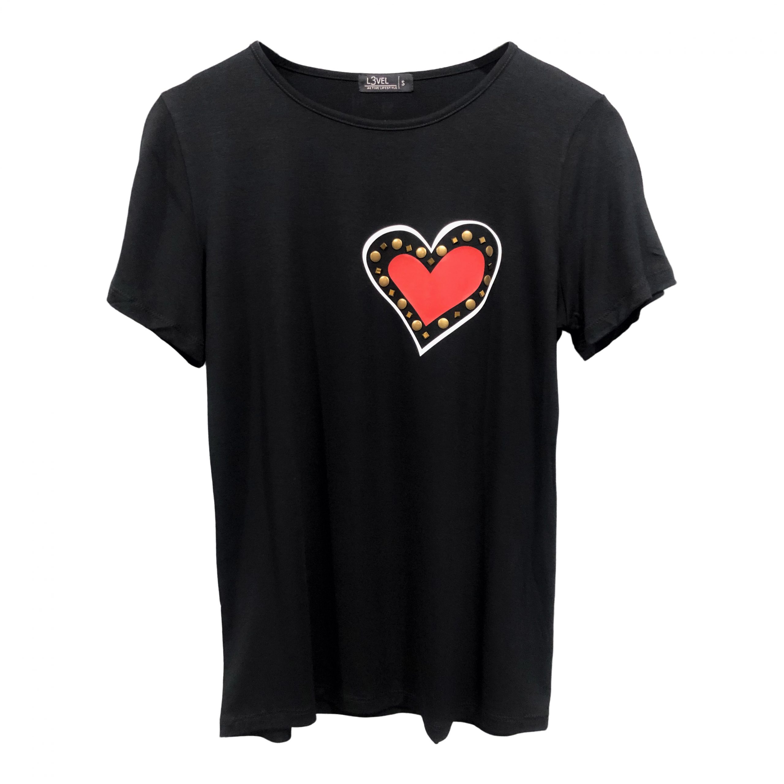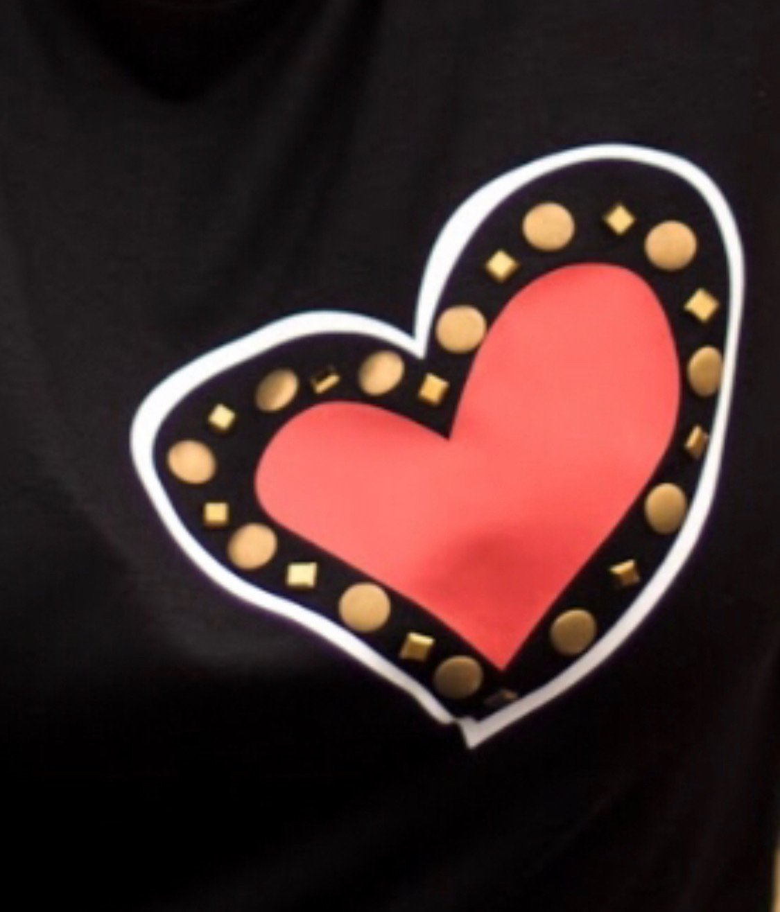 Camiseta de viscosa y spandex, con mangas y cuello redondo, con diseno de corazón en vinil textil y tachas color bronce.