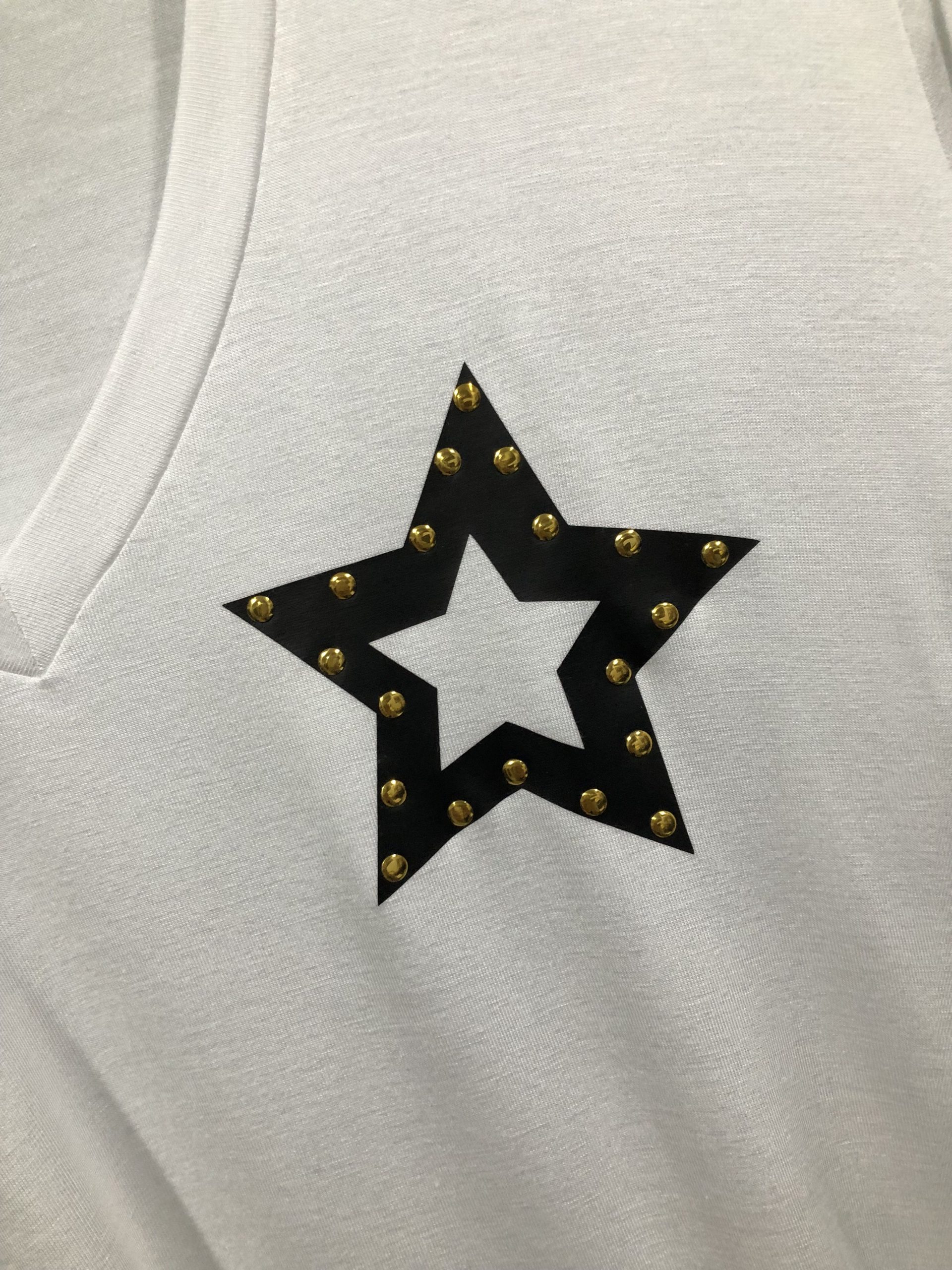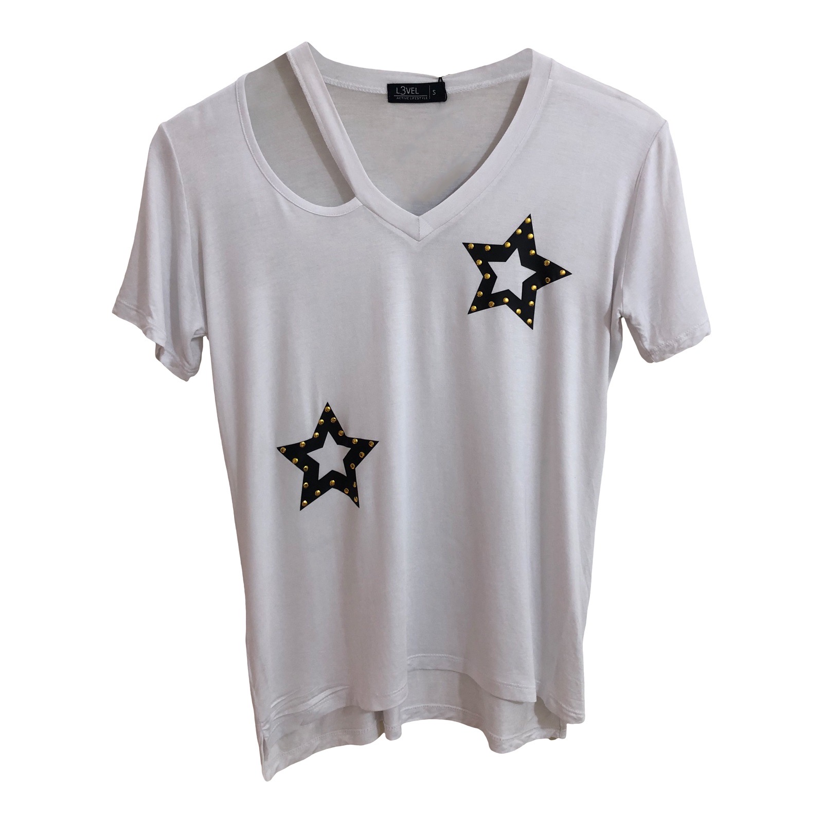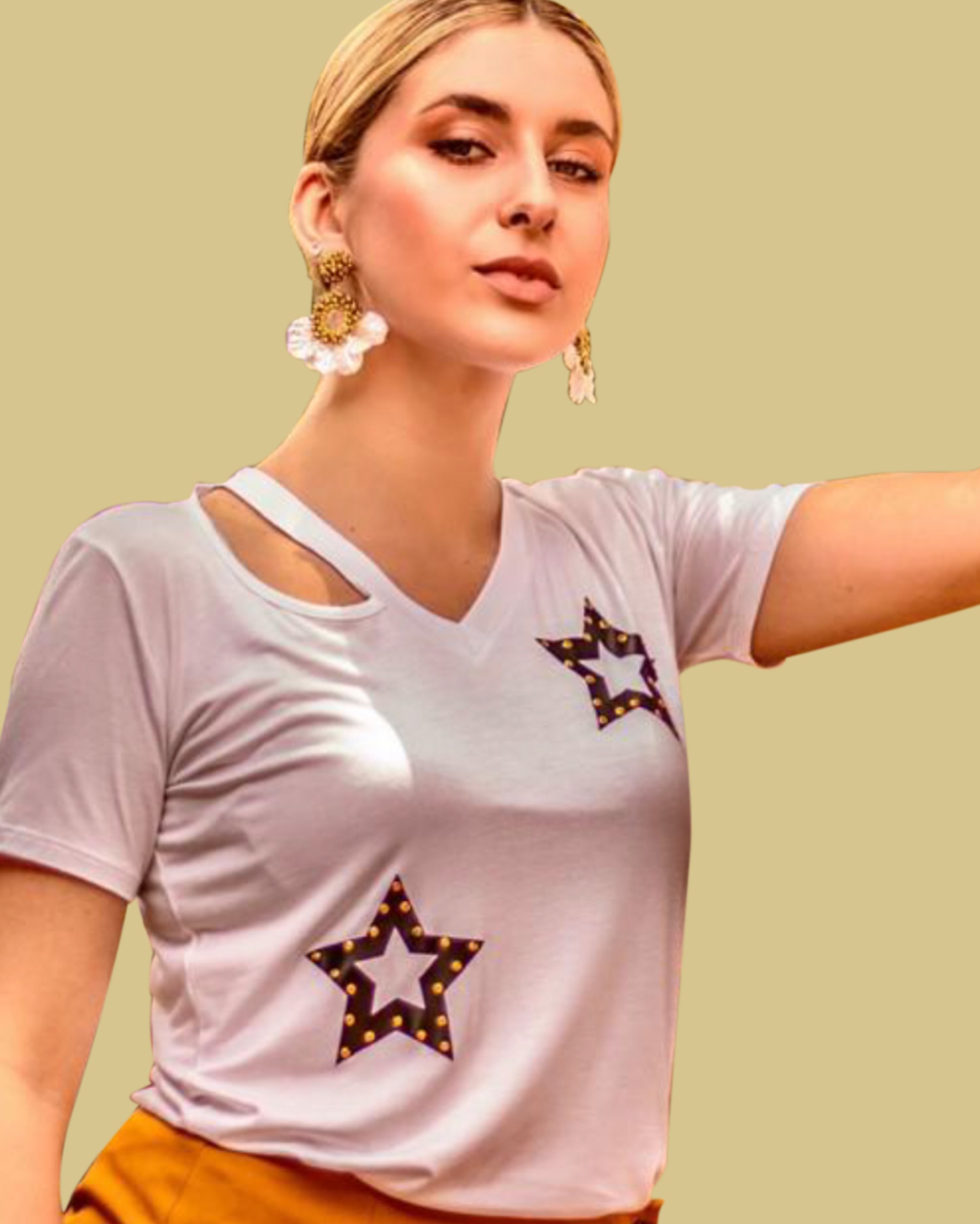Camiseta de viscosa y spandex, con mangas con cuello en V y roto a un lado, con diseno de estrellas de vinil textil y remaches redondos dorados.