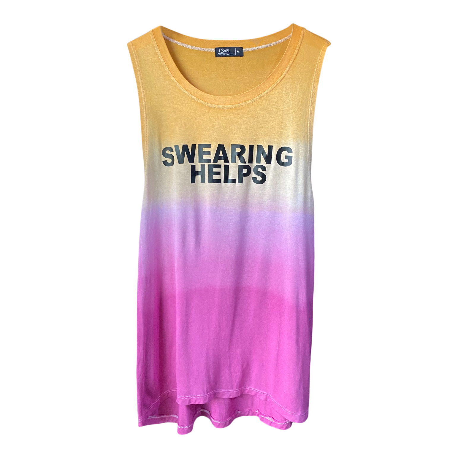 amiseta de viscosa y spandex, cuello redondo, sin mangas y rebajada a los lados, aplicación de técnica Tie Dye de colores naranja y rosado y diseno de vinil textil.