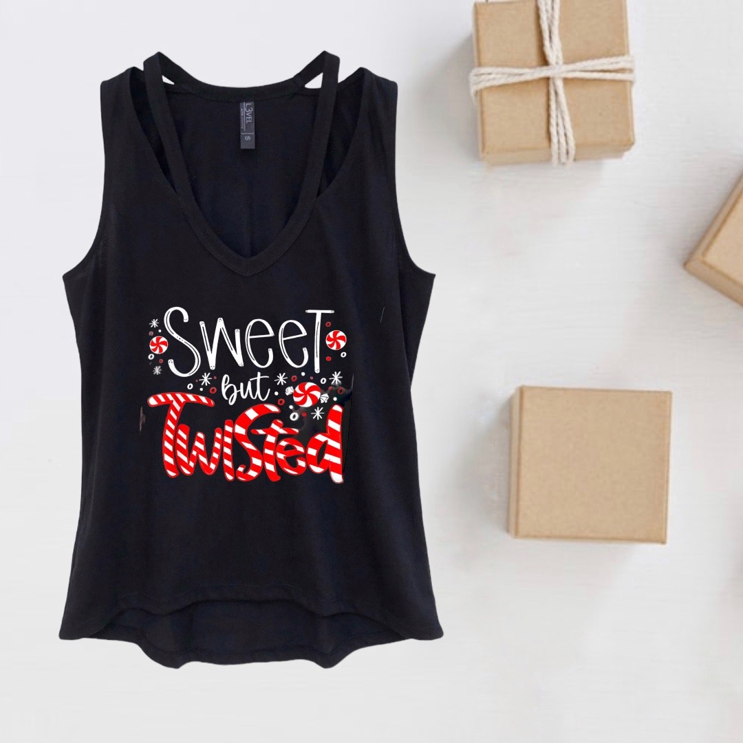 Camiseta de viscosa y spandex, sin mangas y cuello en V con 2 tiras a los lados, con diseño de vinil textil.