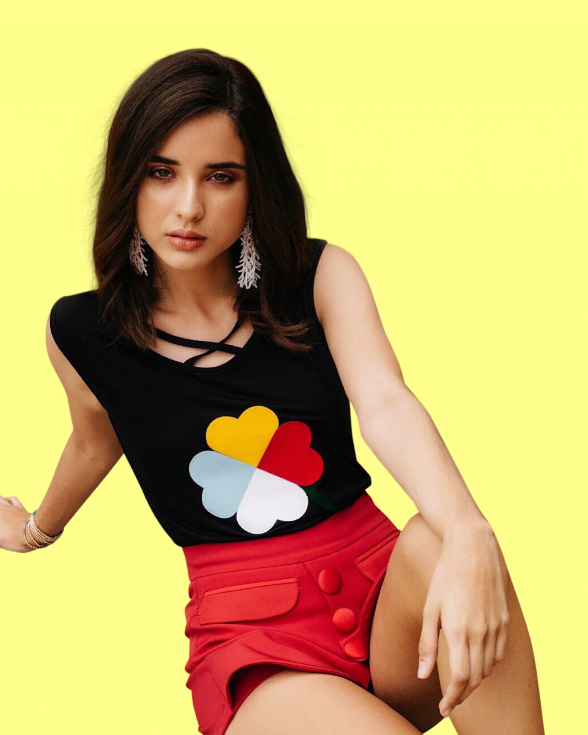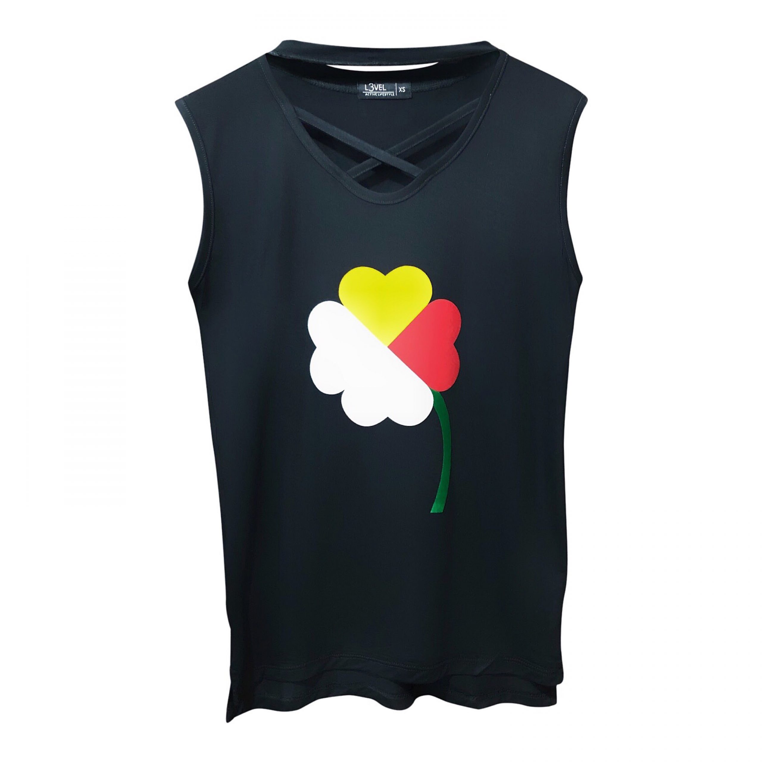 Camiseta de viscosa y spandex sin mangas y tiras cruzadas adelante con diseno de trébol de colores en vinil textil de terciopelo.