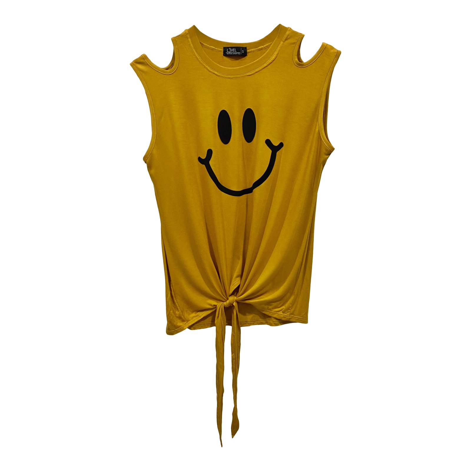 Camiseta de viscosa y spandex, sin mangas, cuello redondo con dos aberturas en los hombros y nudo adelante, con diseno de vinil textil de terciopelo negro.