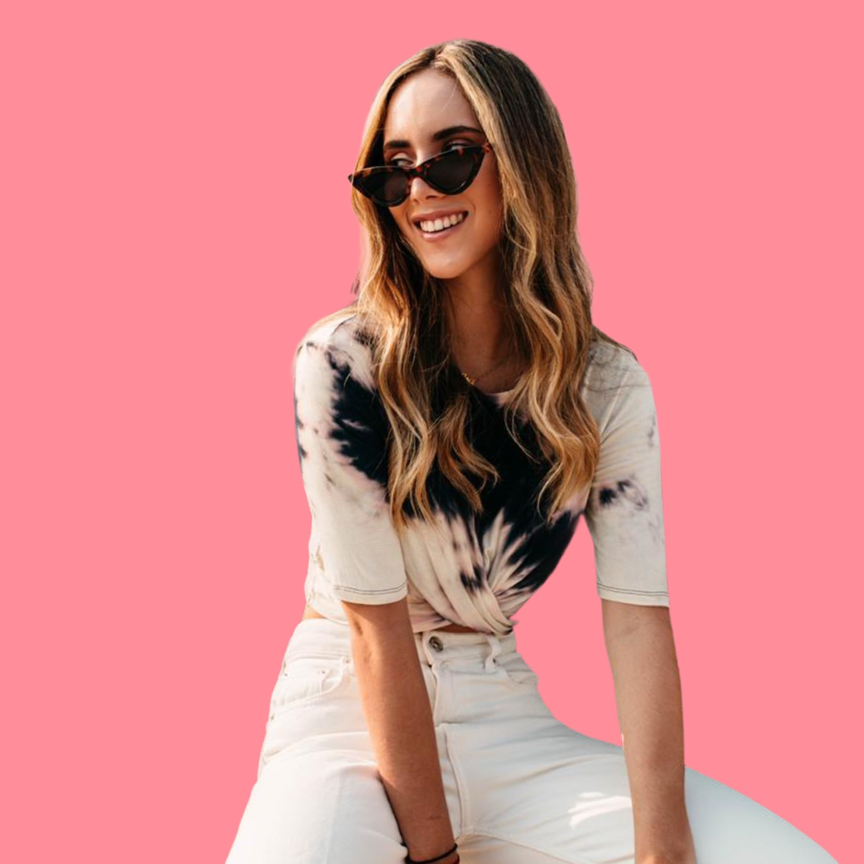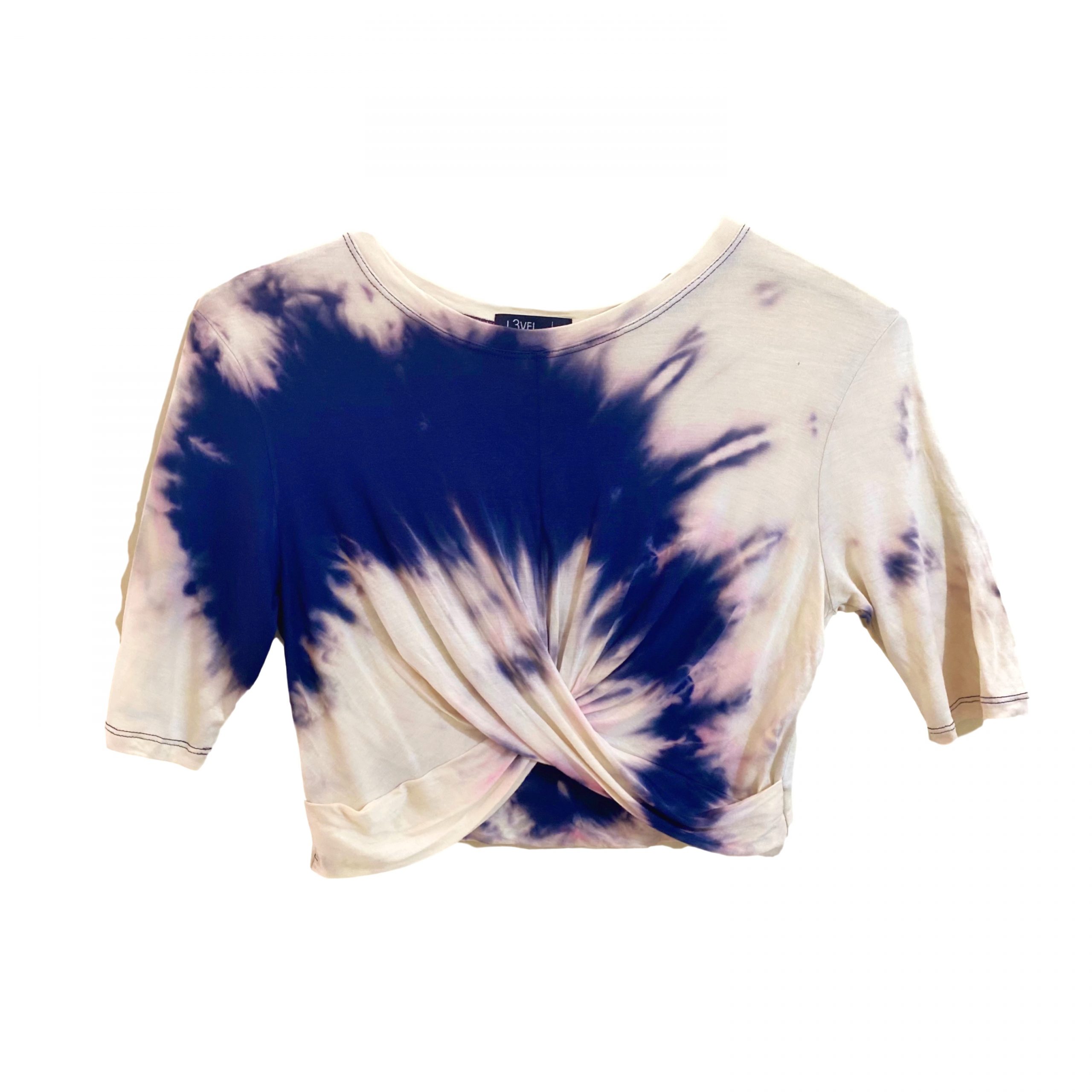 Crop Top de viscosa  y spandex, cruzado adelante con mangas 3/4  y  aplicación de técnica Tie Dye sobre color azul.