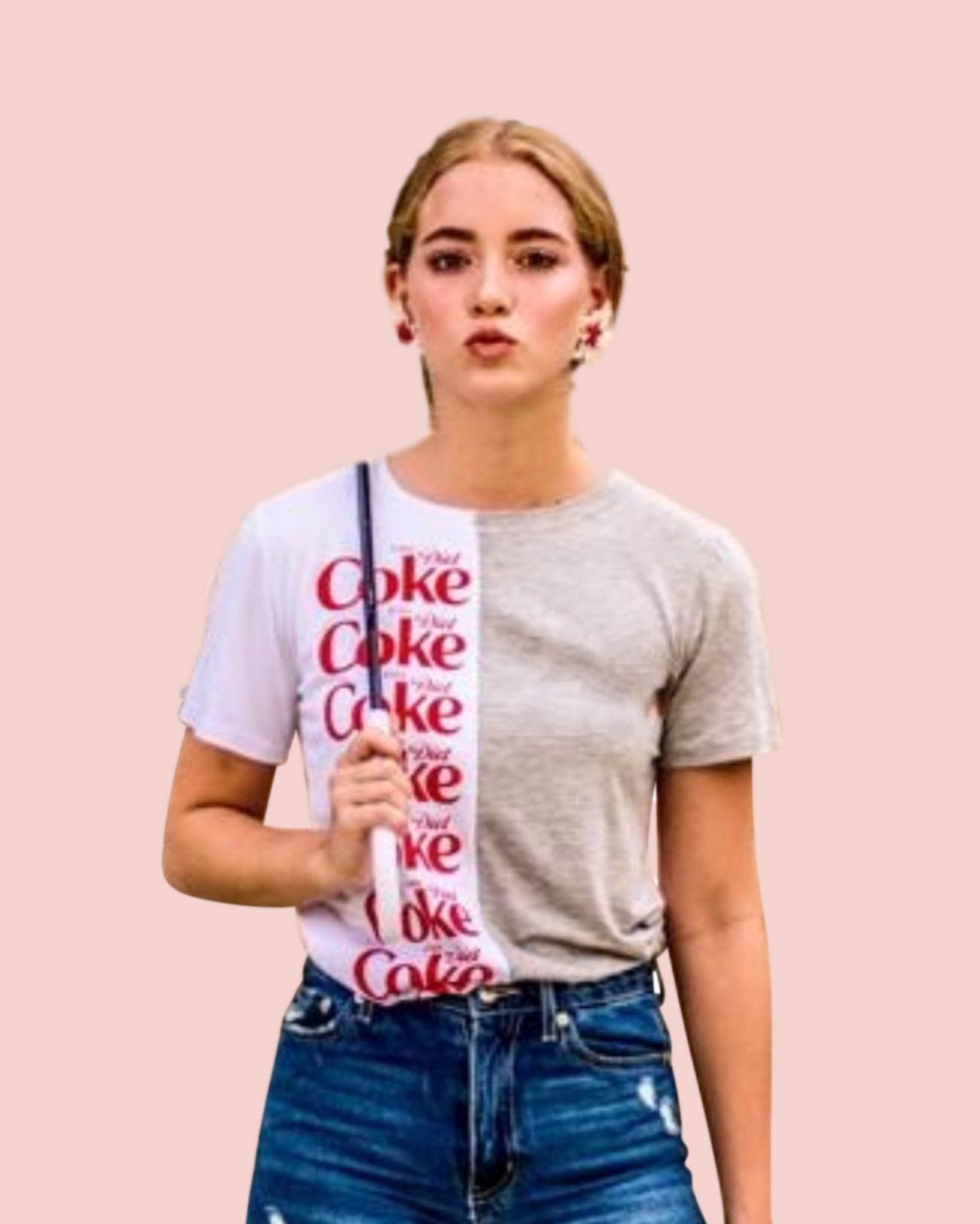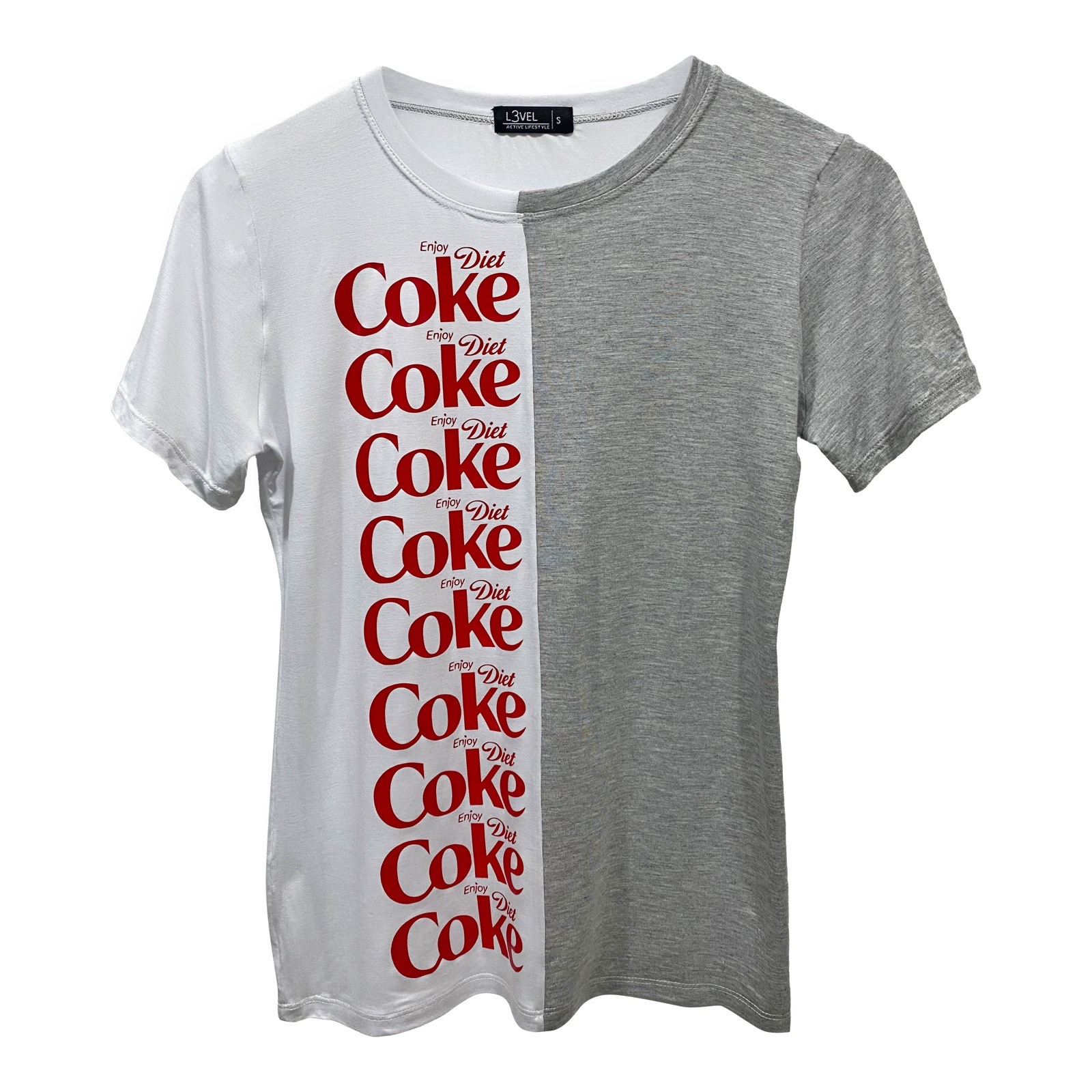 Camiseta de viscosa y spandex, con mangas y cuello redondo, mitad color blanco y mitad color gris, con diseno de vinil textil.