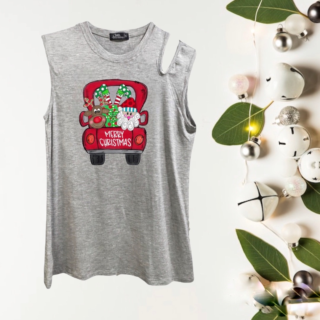Camiseta de viscosa y spandex, sin mangas y cuello redondo y abertura en hombro, con diseño de vinil textil.
