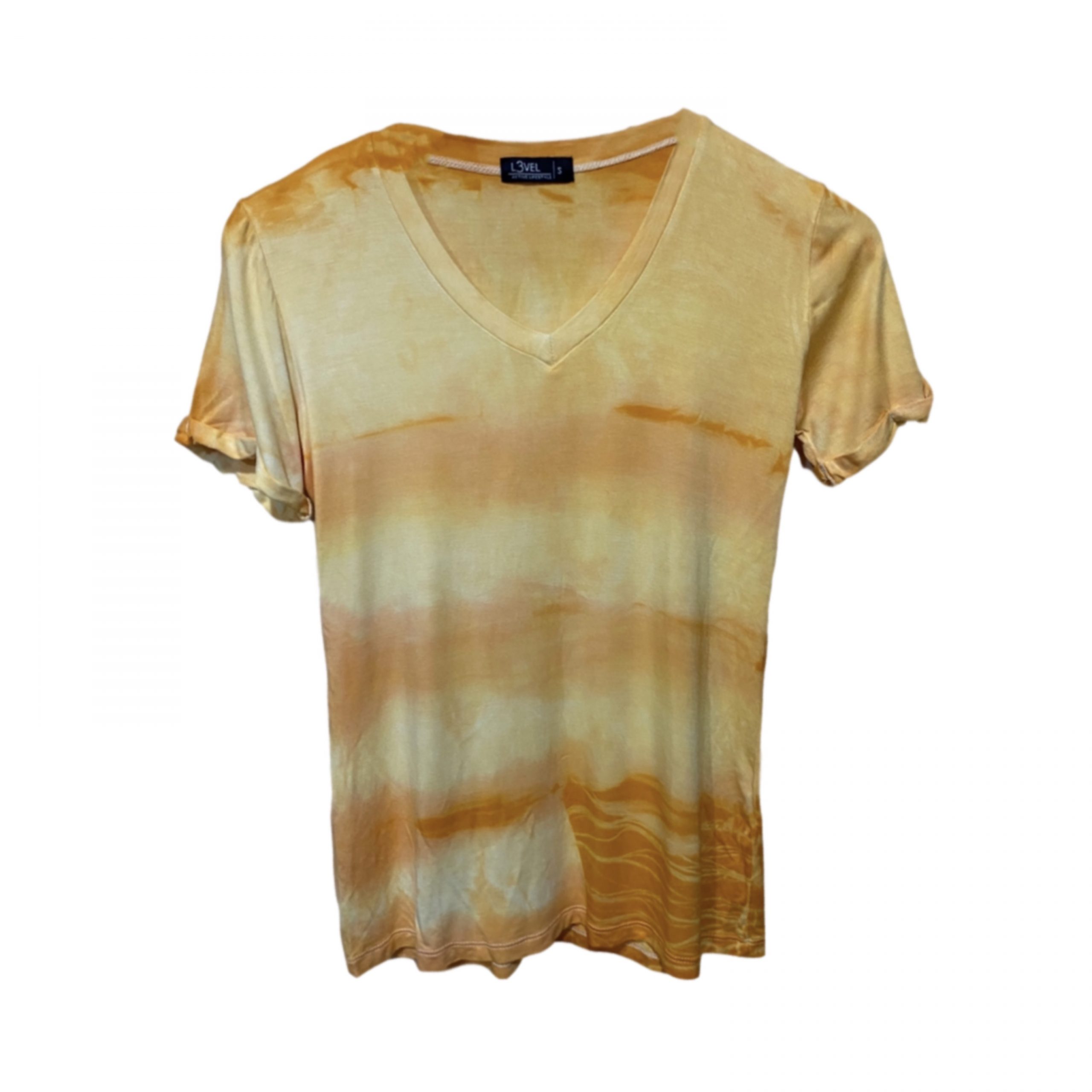 Camiseta de viscosa y spandex, con mangas con cuello en V y aplicación de técnica Tie Dye en color amarillo.